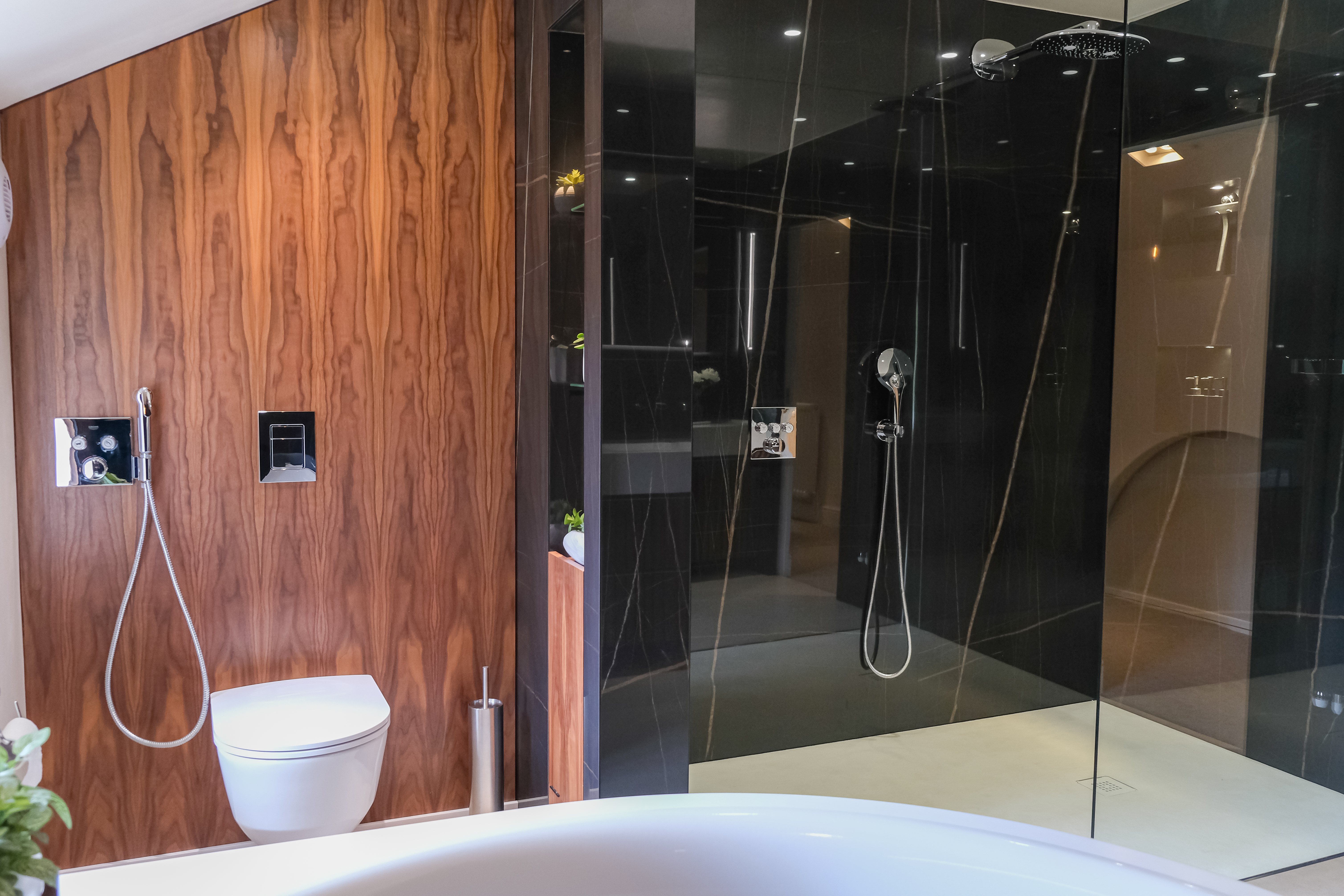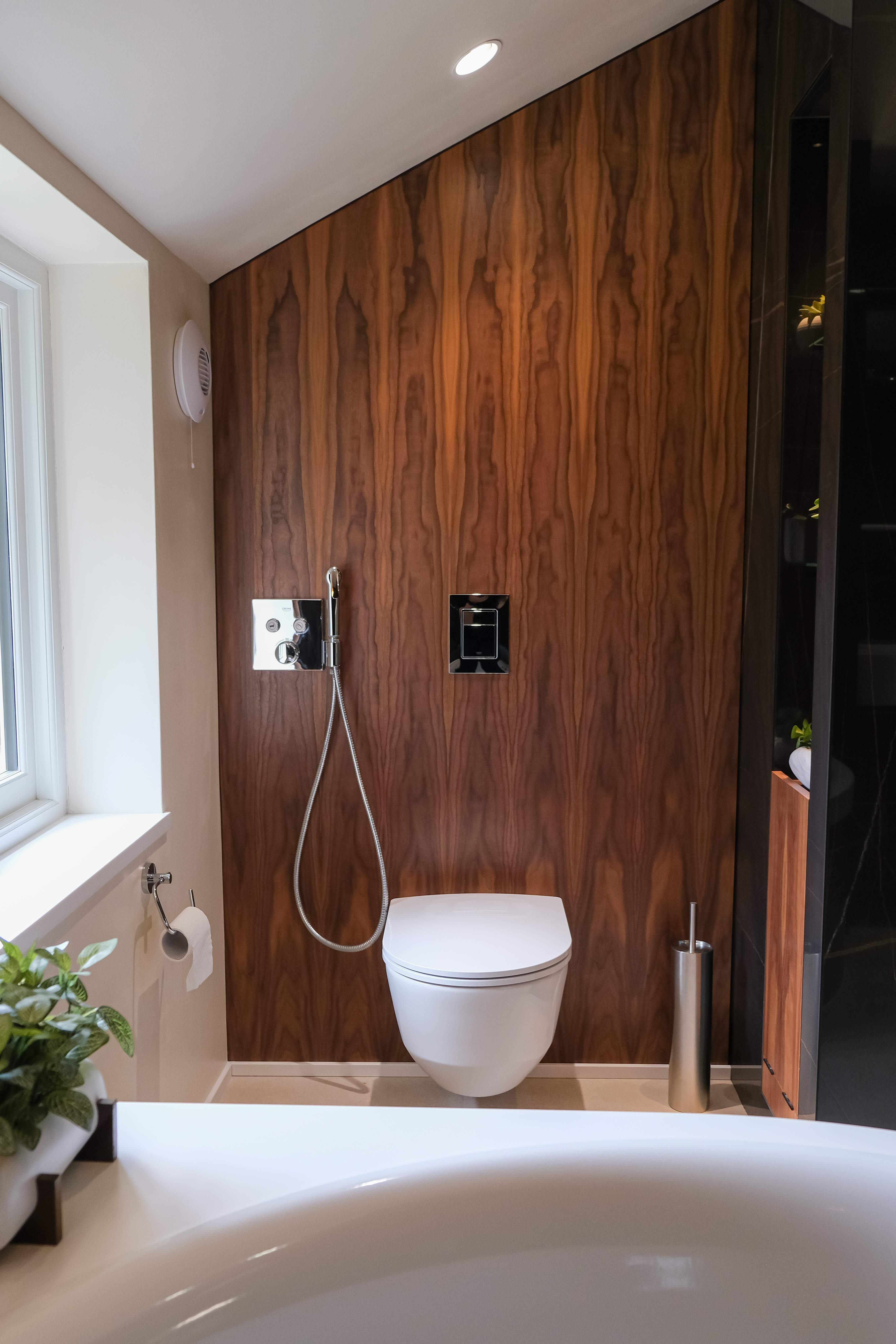 Warmth and texture are introduced through bespoke wooden cabinetry and wood panelling, which frame the freestanding bath and highlight the feature wall behind it. This natural wood finish adds an inviting, organic touch to the space, complementing the modern elements and balancing the overall aesthetic.