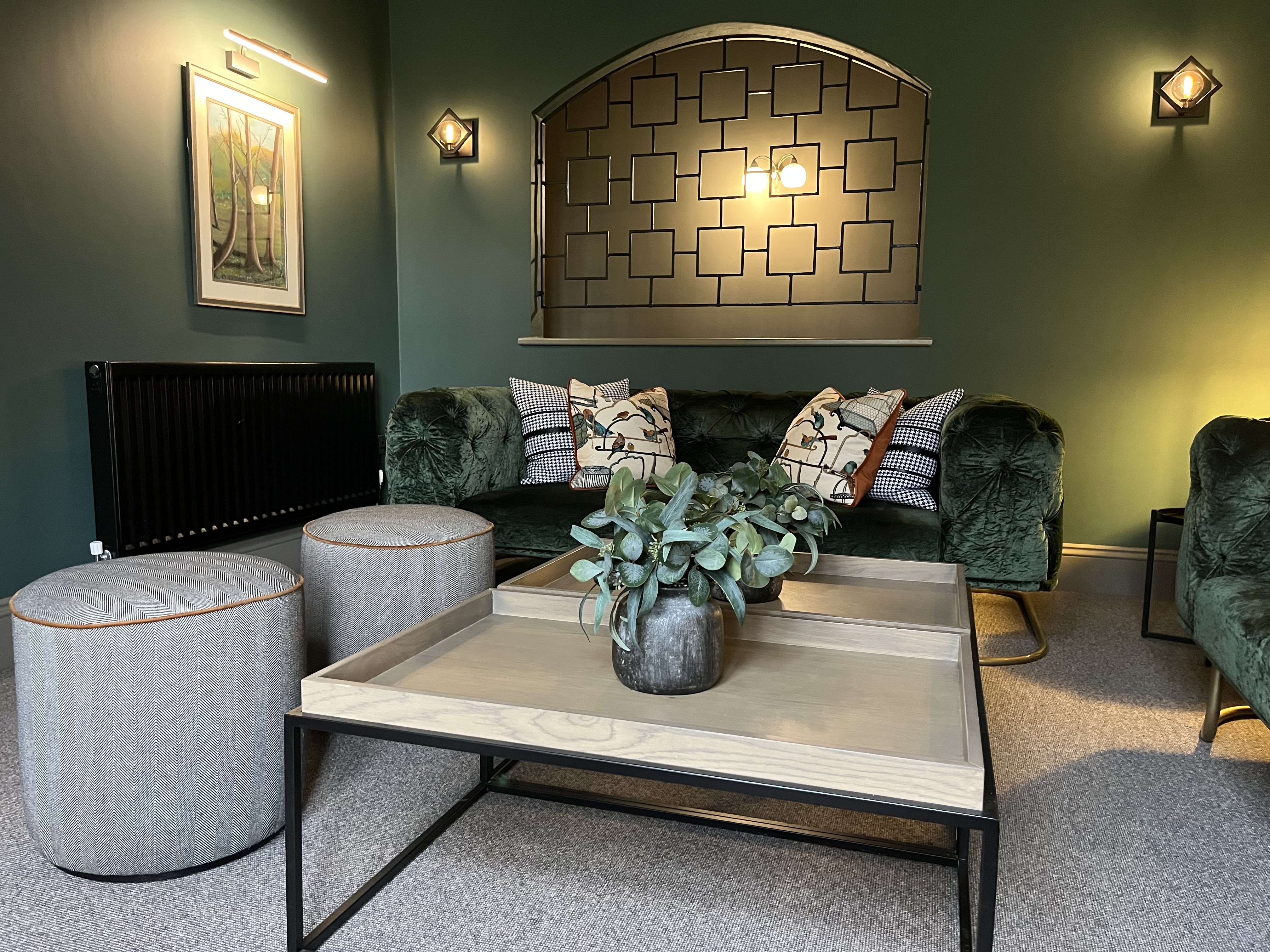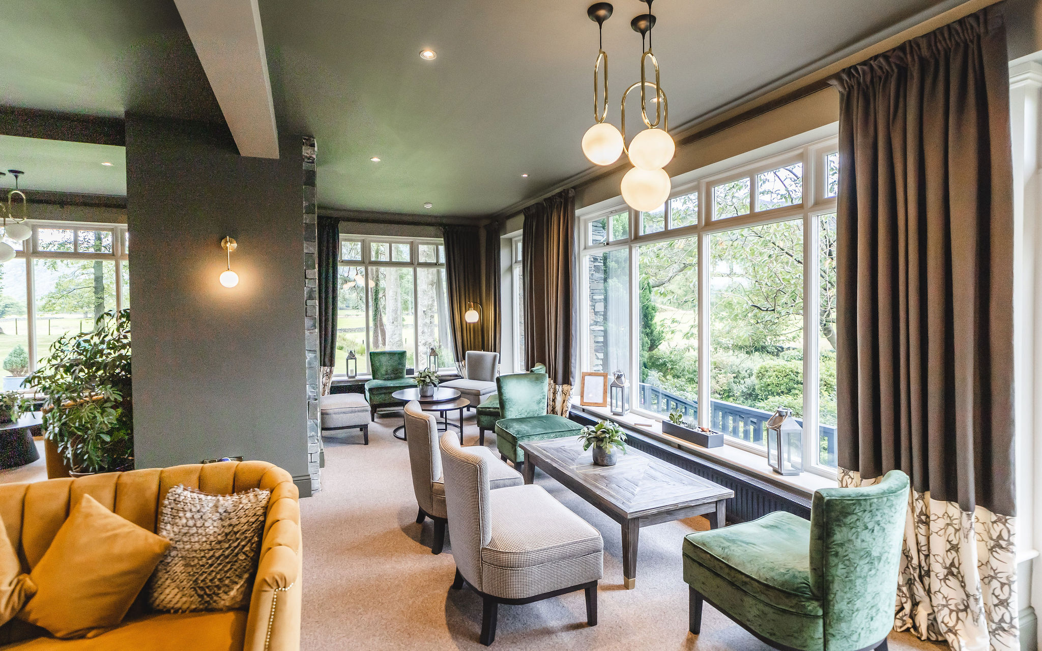 We created a scheme that was contemporary and elegant, ultimately offering usability and longevity in this high-footfall area. Brushed gold accents, such as the foot rails below the bar, the fretwork within the bar and restaurant, the light switches, as well as bubble-like light fixtures, ensure a cohesive look throughout the entire space. Weʼve used earthy tones to echo the beautiful surroundings of the lake district, this colour palette of dark greens, warm tans, and soft khaki tones also complements the elegant evening vibe when this space is mostly used.