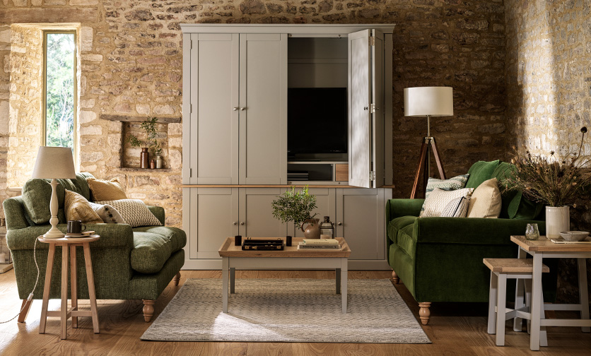 You are here: The Cotswold Company project Living See The Cotswold Company profile Gallery Chester Pure White Sofa Table, Chester Pure White Square Coffee Table, Jackson Right Hand Chaise Sofa in Aquaclean Oxford Sage Nancy Armchairs, Rustic Weave, Natural, Mitford, Chunky Cotton , Stone Elkstone Mellow Oak Console Table, Elkstone Mellow Oak Sofa Table, Elkstone Mellow Oak Coffee Table Talbot Sofa in Aquaclean Oxford, Sage, Hurley in Matt Velvet, Fir, Chester Dove Grey Square Coffee Table, Chester Dove Grey Hideaway Media Unit Chadwick Sofa in Deep Blue, Matt Velvet & Camille Limewash Oak Coffee Table Talbot Sofa in Aquaclean Oxford Sage & Elkstone Mellow Oak Coffee Table Ashbee Sofa in Chunky Cotton, Stone, Berkeley Sofa Table, Berkeley Coffee Table