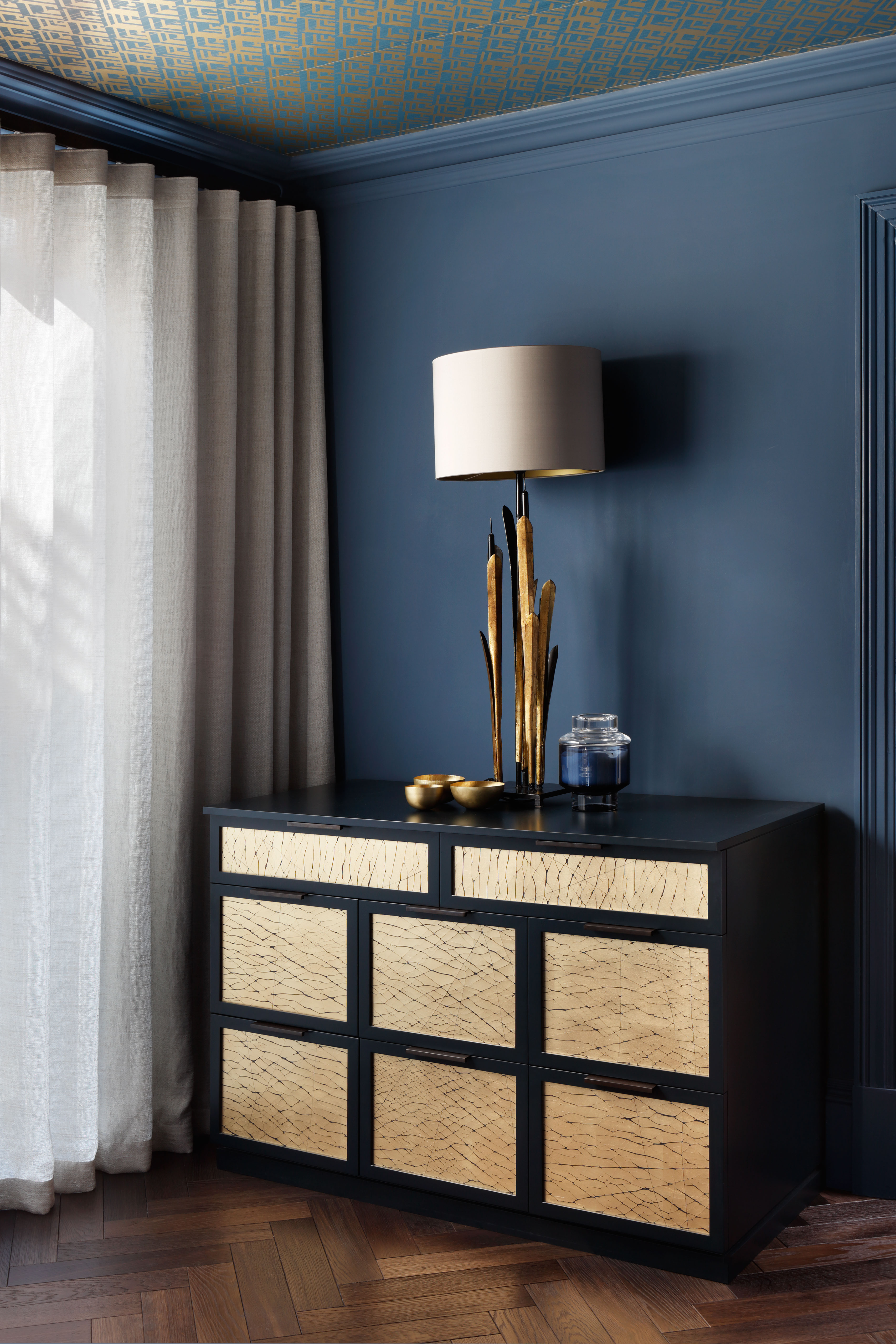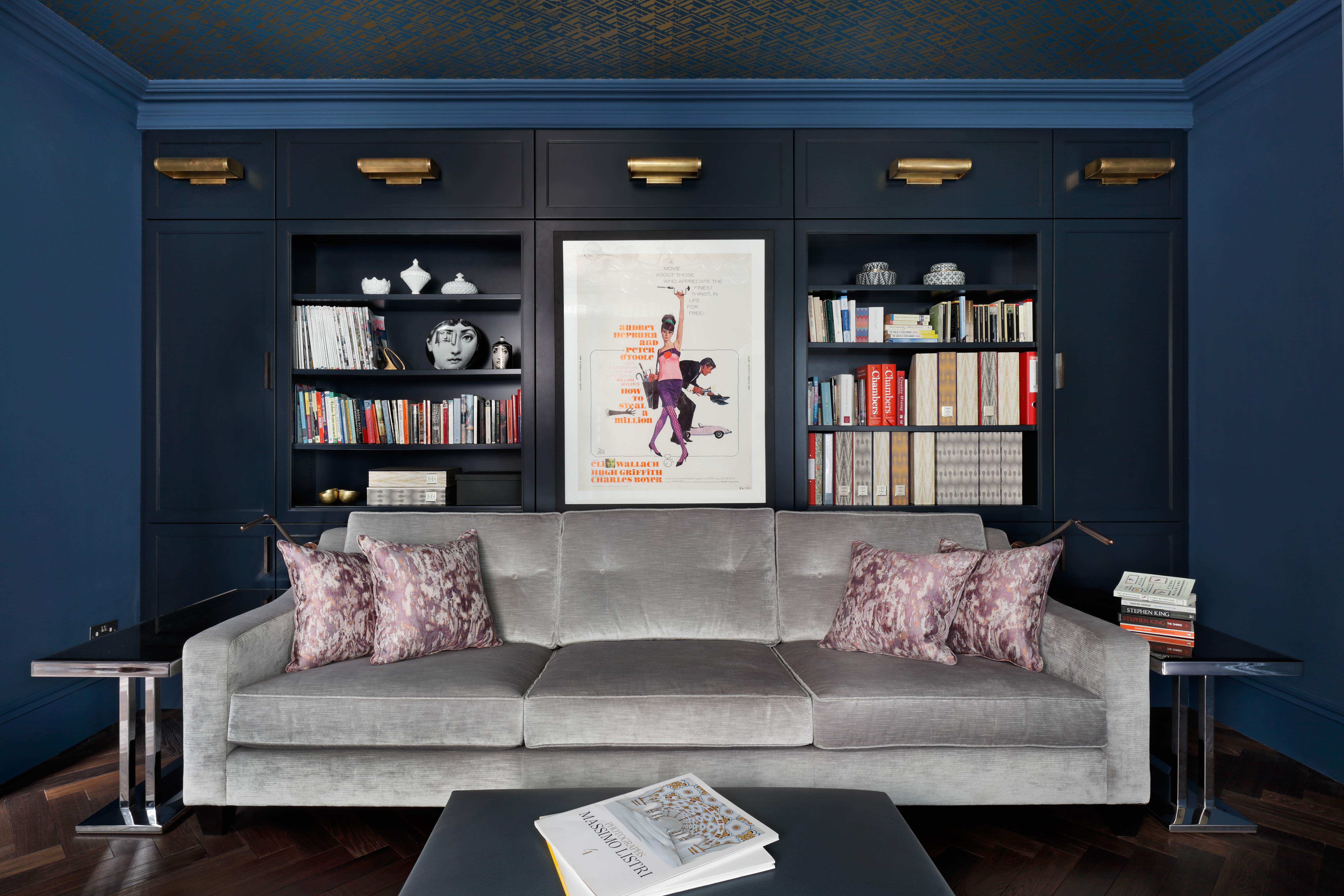 The study has a wow factor with dark walls and a patterned wallpapered ceiling contrasting with light furniture and plenty of art work.