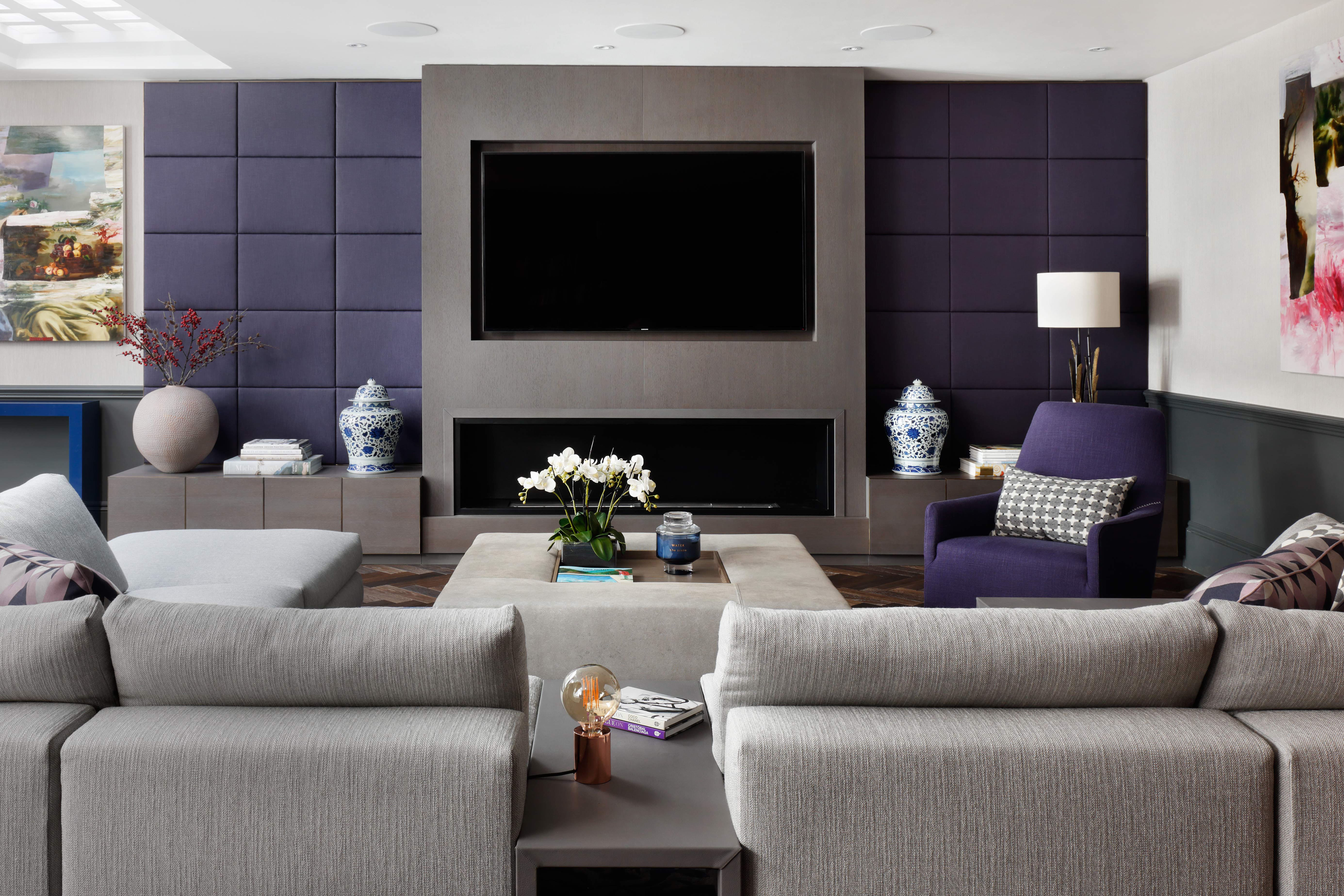The brief for this recently completed project was to transform the basement area of the house into a more useable, cosy and family friendly space. The new layout for the media room with a modular Minotti sofa transformed the space by making the seating area more compact. Fabric panelling each side of the fireplace and sheer curtains further softened the space.