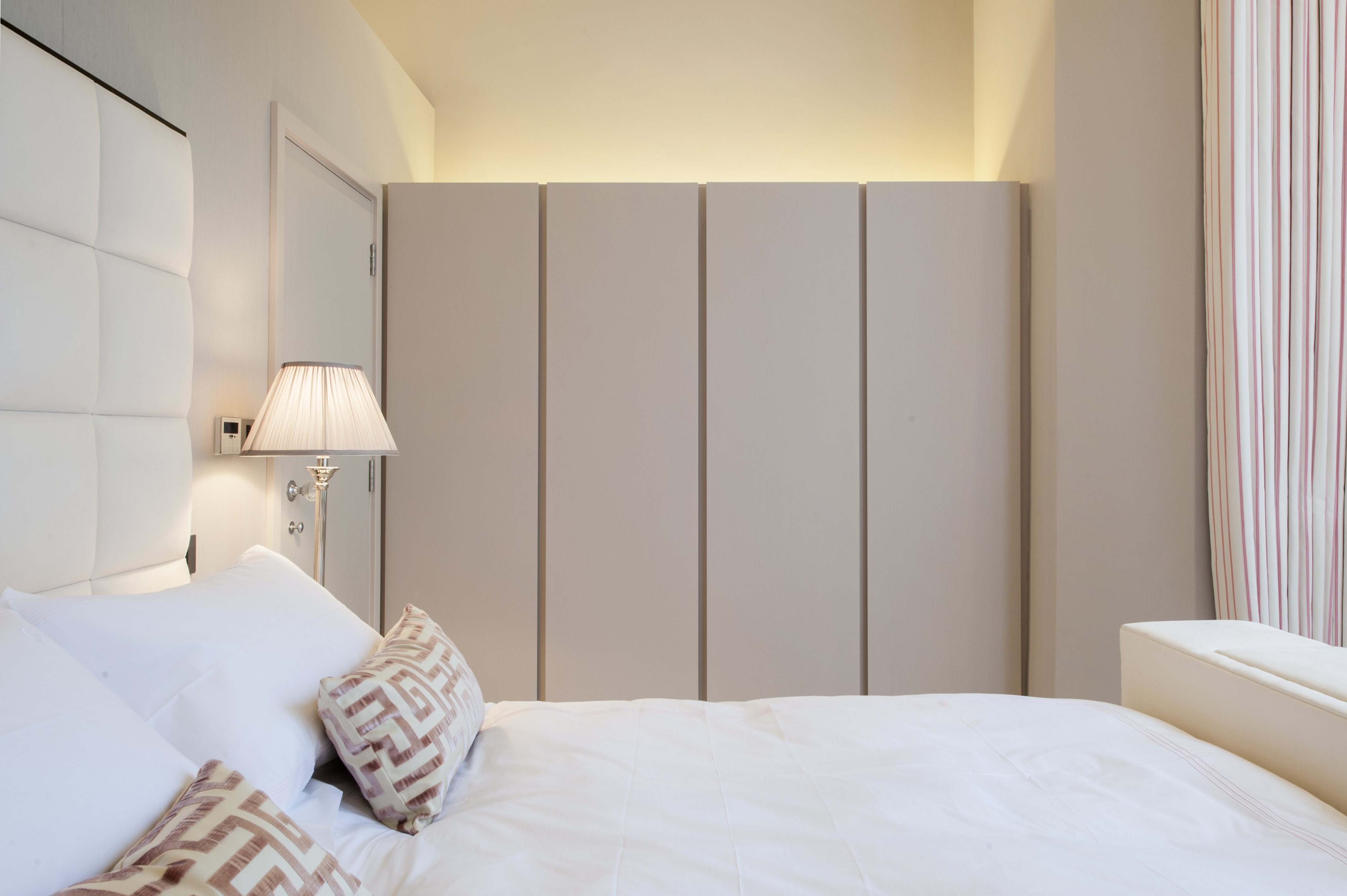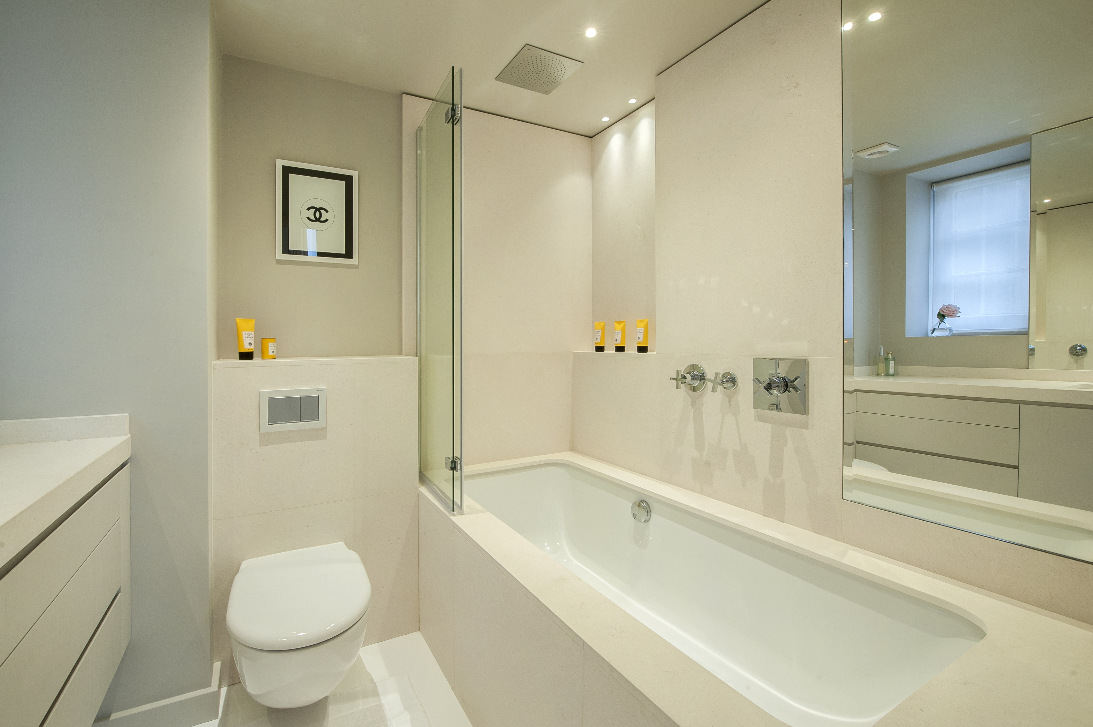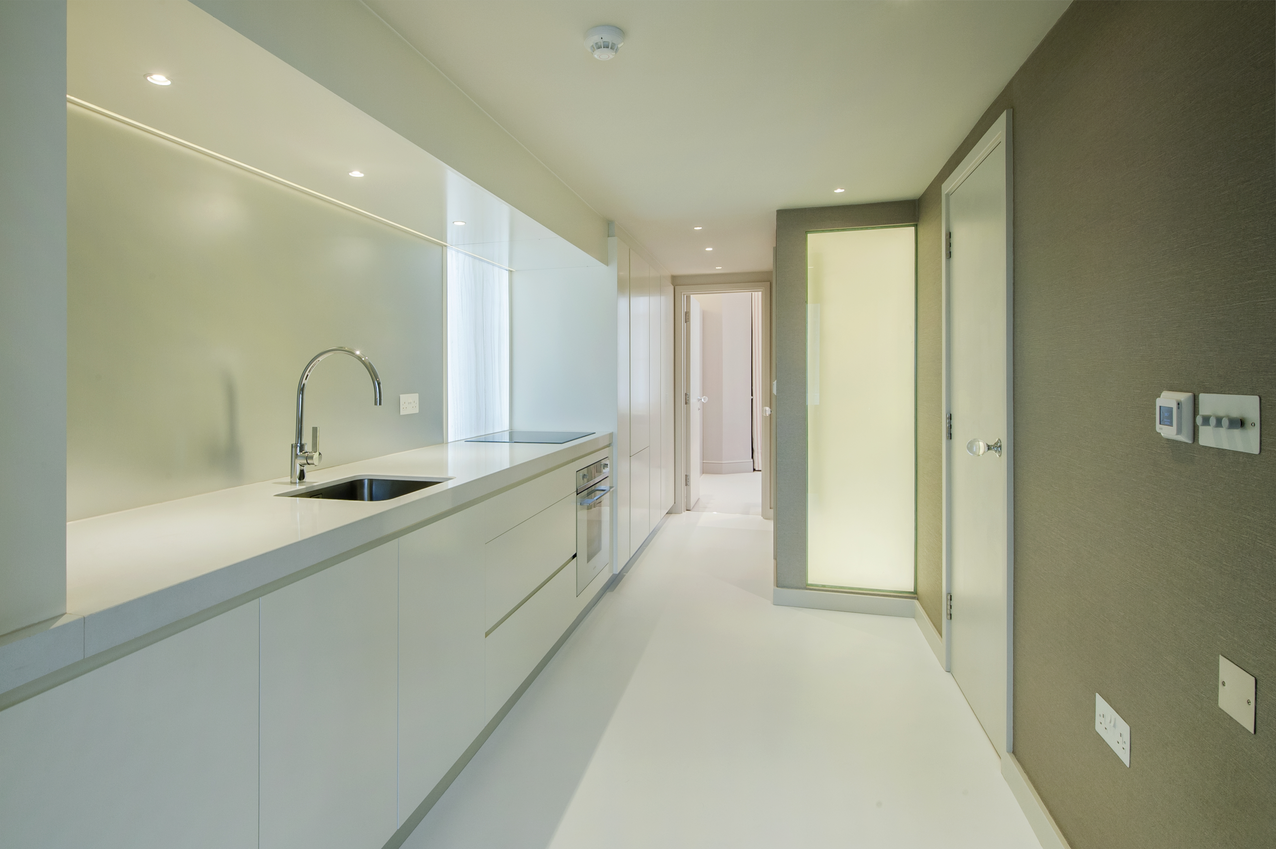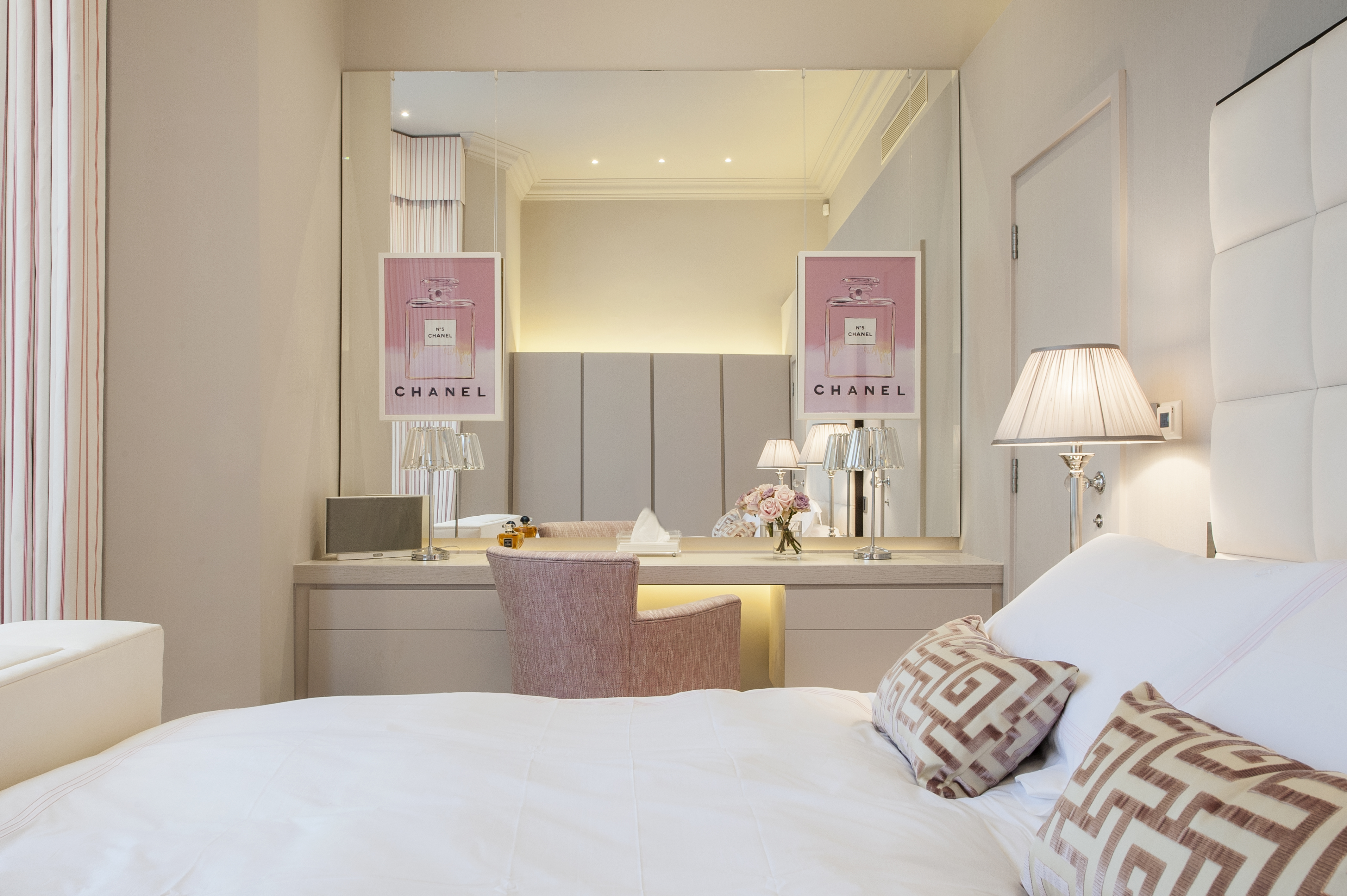 The original flat was very dated with a tiny kitchen in the centre of the floor plan. The entire interior and 1970’s partition walls were removed which provided me with a blank canvas to create new spaces. Out of a 1 bedroom flat we created a 2 bedroom, 2 bathroom flat with a raised chill out cinema area that could be used as an additional sleeping space. The glamorous client wanted the apartment to reflect her love of fashion and in particular, Chanel.