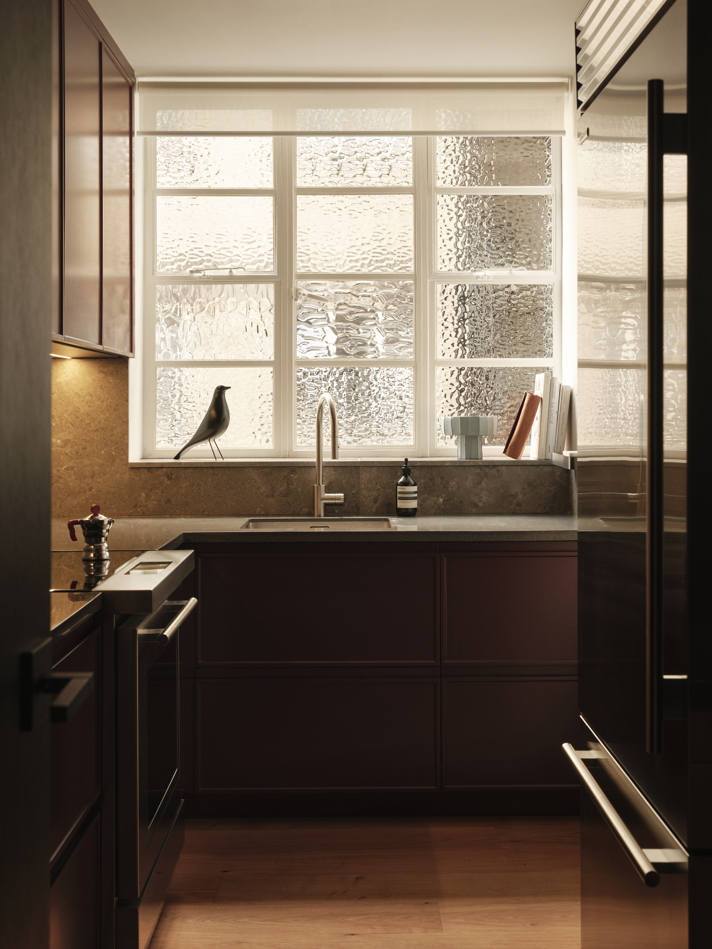 The result is a highly efficient yet visually striking layout, where the rooms function independently while maintaining a cohesive connection. Expansive wooden surfaces and a refined material palette enhance the apartment’s sense of warmth and sophistication. Upon entering, a dramatic hallway in deep, elegant tones contrasts the bright, open kitchen and living spaces beyond.