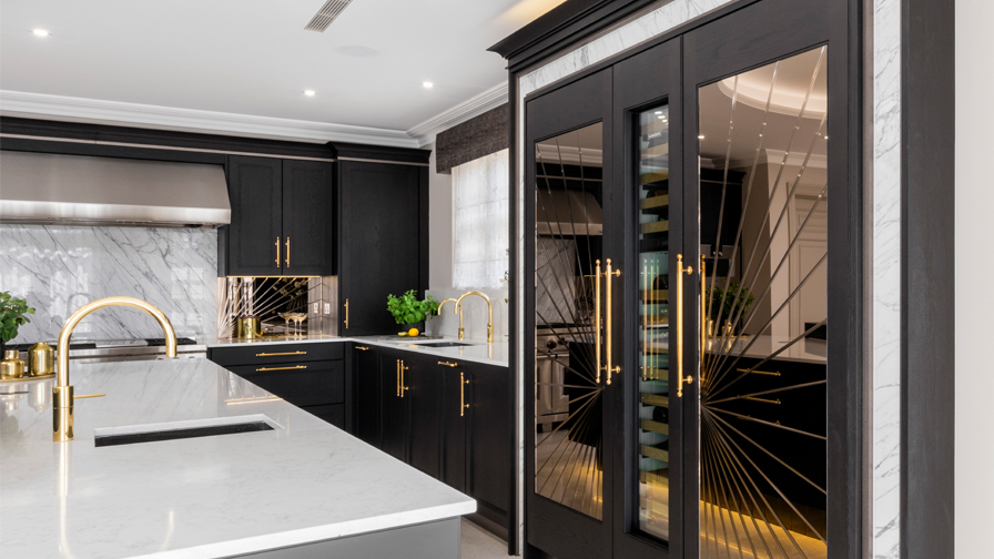 Art Deco motifs are present throughout The Lakehouse kitchen and interior. From stepped door details to geometric patterns and forms, this home is a beautiful demonstration of blending the contemporary style of today with the features from iconic design movements of the past. In homage to Art Deco design, the quintessential sunburst pattern appears in custom-etched glazing throughout the kitchen. Bronze mirrors in symmetrical sunburst designs frame the Wolf range cooker and Statuarietto Extra marble splashback.