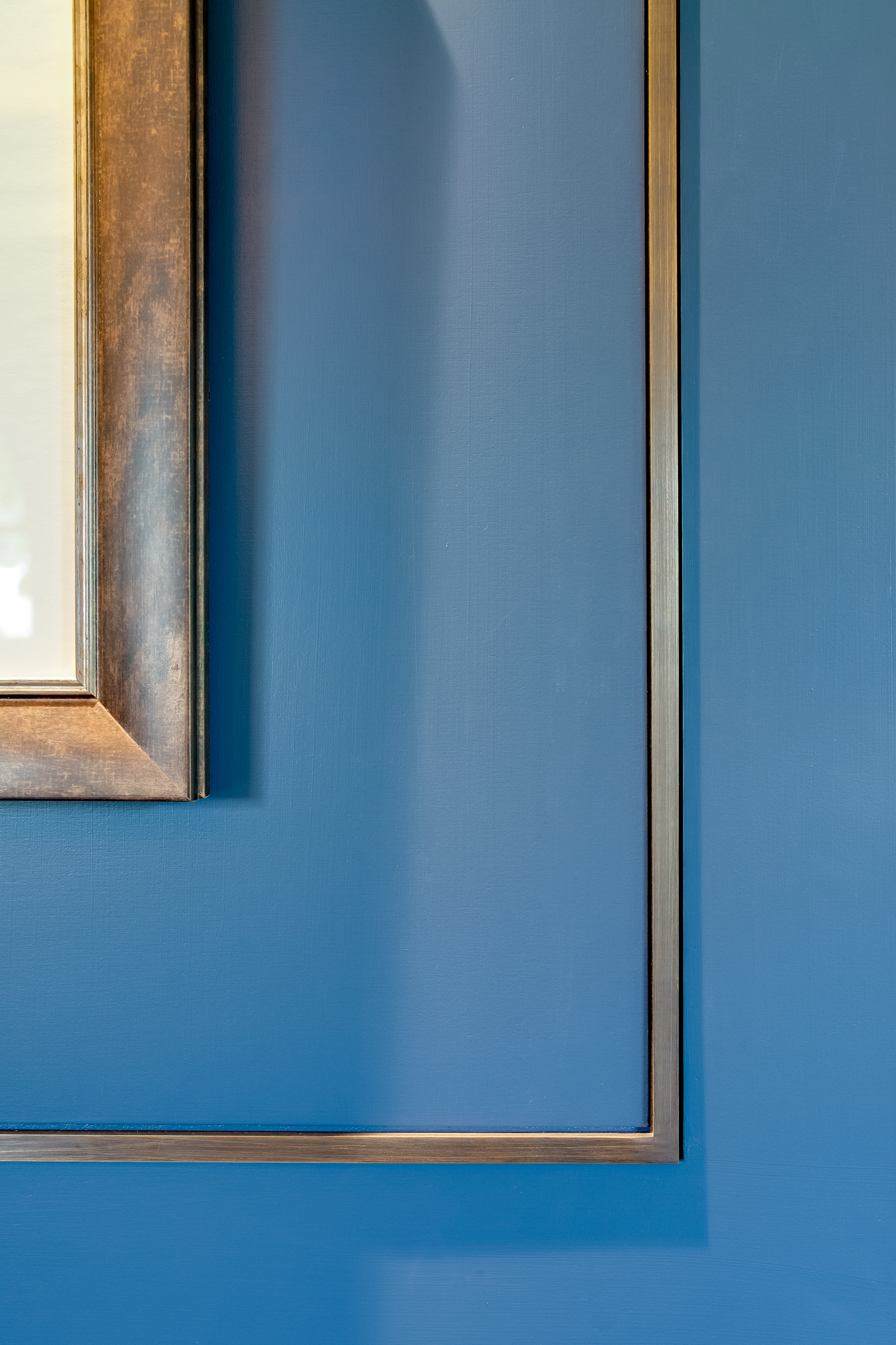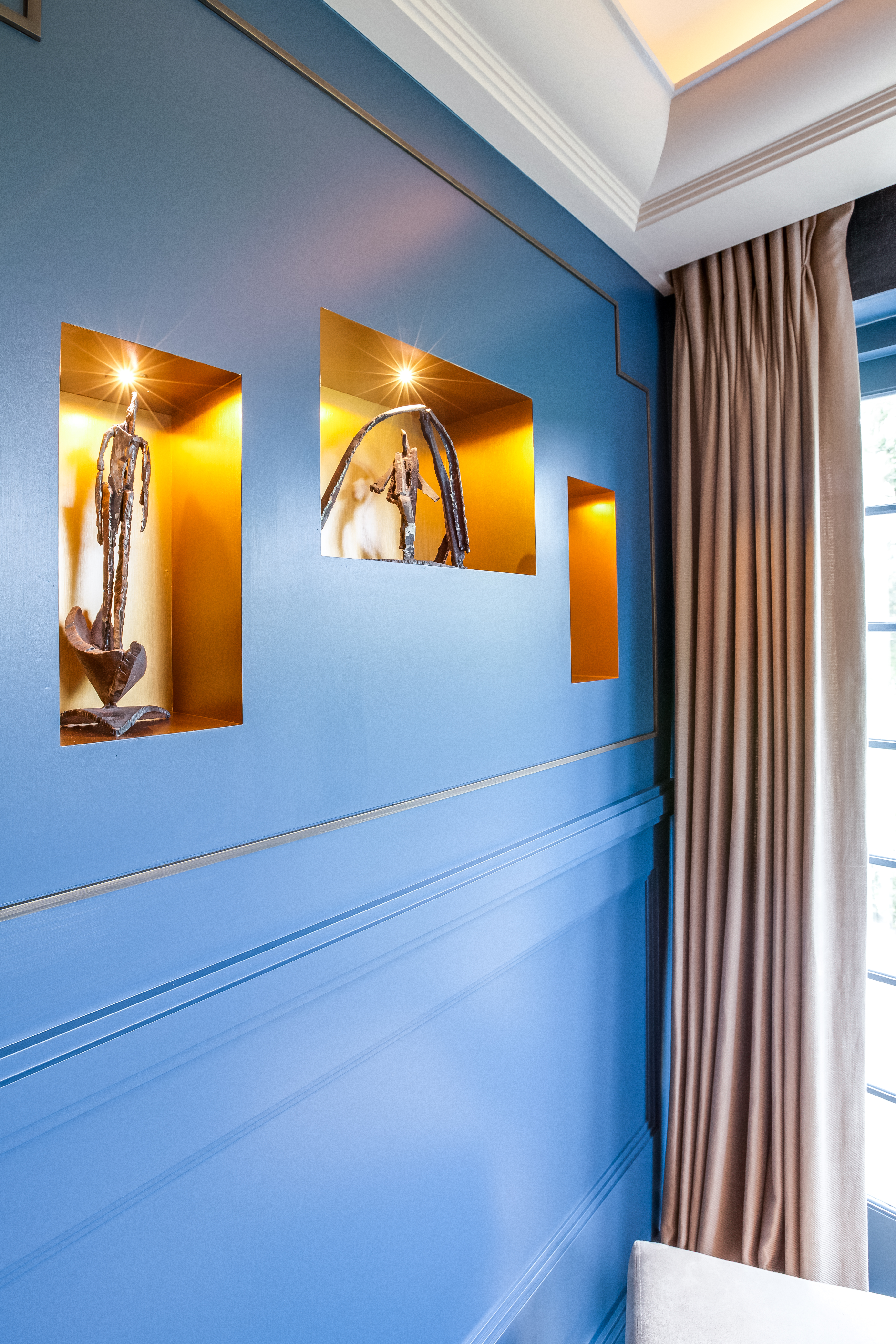 The front of the bar is clad in Whistler premium leather and topped with a striking, bespoke pewter surface while the panelling and woodwork is painted in Fired Earth’s Carbon Blue. The bar is on wheels so it can be moved to maximise space. Alcantara fabric on the banquette seating and poufs. Stereo Interior Sacramento Grasscloth wallcoverings. Bespoke, panelled stud wall and with recesses.