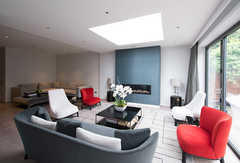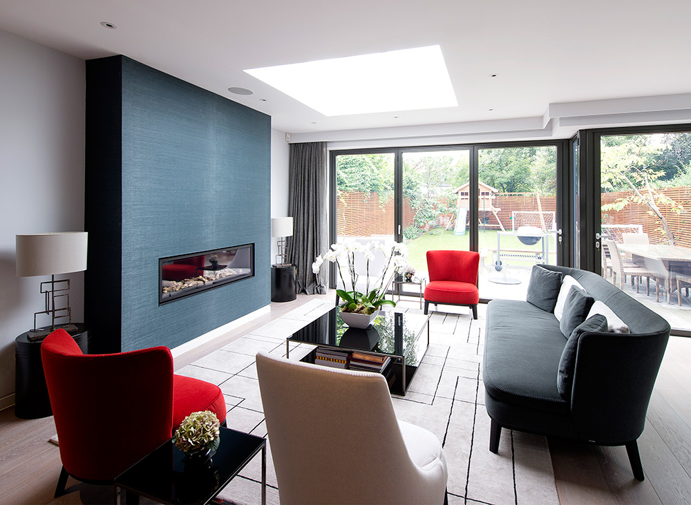 Designing for a small family we focused on zoning the space and creating an additional sitting area in the family room to make the space work for the whole family. We designed and installed a fireplace to clearly define the new zone, cladding the wall in a stunning seagrass wallpaper to give a luxurious feel and created balanced with stunning Porta Romana table lamps sat proudly on antique hat boxes either side of the fireplace. The introduction of a bespoke statement graphic rug from the Rug company in a generous size gives a feeling of space and clearly zones the new sitting area.