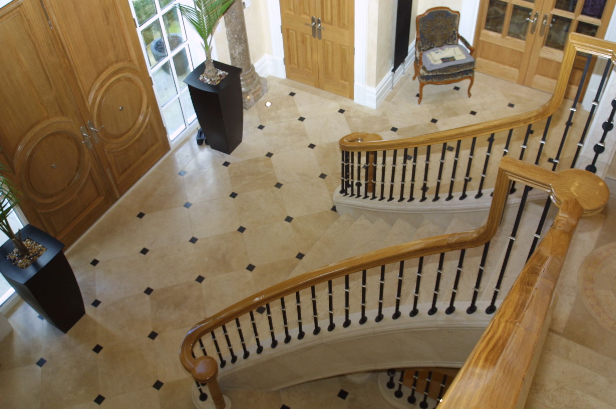 We designed a new staircase for the main Entrance Hall. The staircase itself was fabricated in steel and then clad in French Limestone with wrought iron spinals and a hand carved oak handrail.