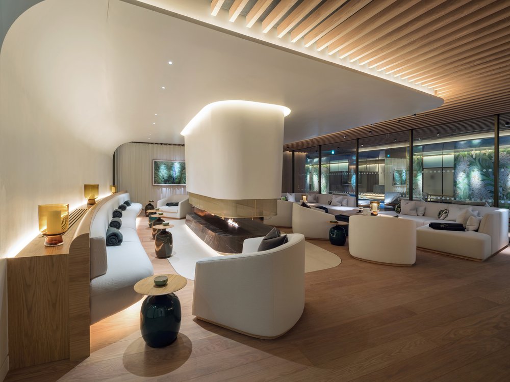 At the centre of the bouclé sofas and armchairs are hand-finished burled oak plinths on top of plush blue table bases. In between the armchairs, similar smaller tops have been paired with green ceramic vases creating a unique and elegant ambience to the spa.