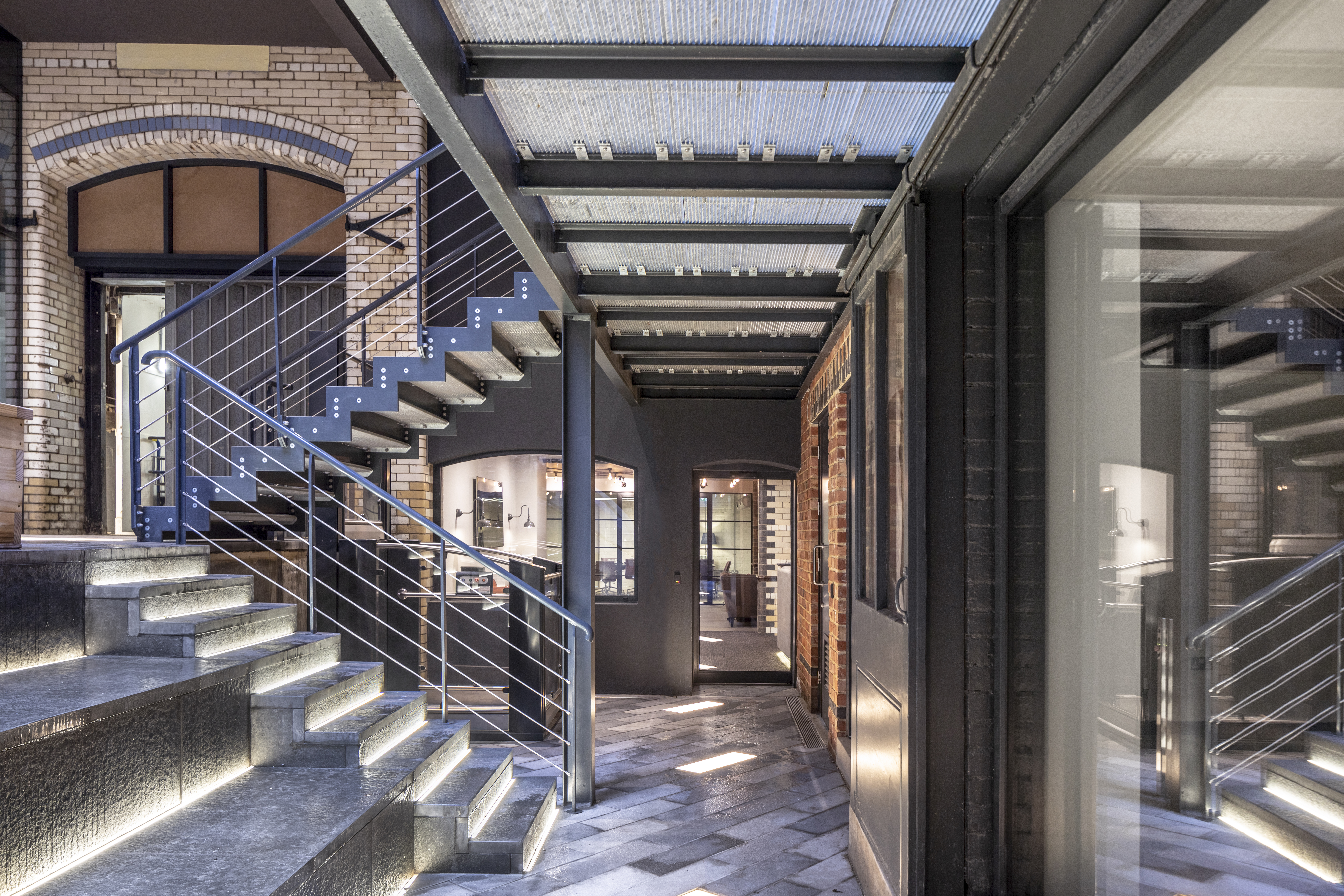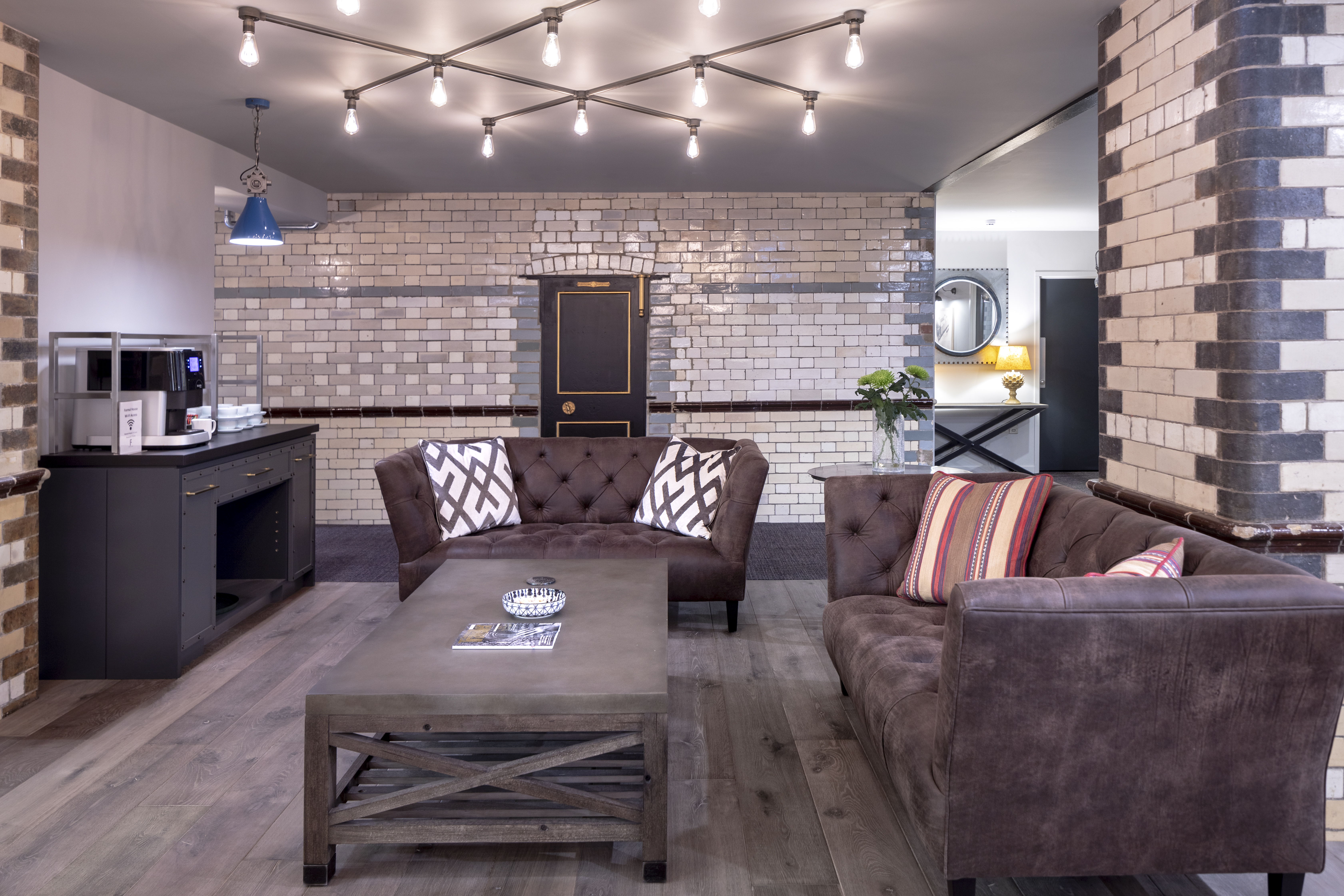 This was a great challenge; a basement in a Victorian storage facility. We completely reconfigured the space to provide a new reception area and 3 meeting rooms along side bike storage, showering and w.c. facilities. I wanted to maximise the potential of the existing space by retaining and making visible such details as the tiled columns, strong room doors and Victorian lift. At the same time we were able to add to the character with industrial glazing, new painted brick walls and reclaimed flooring.