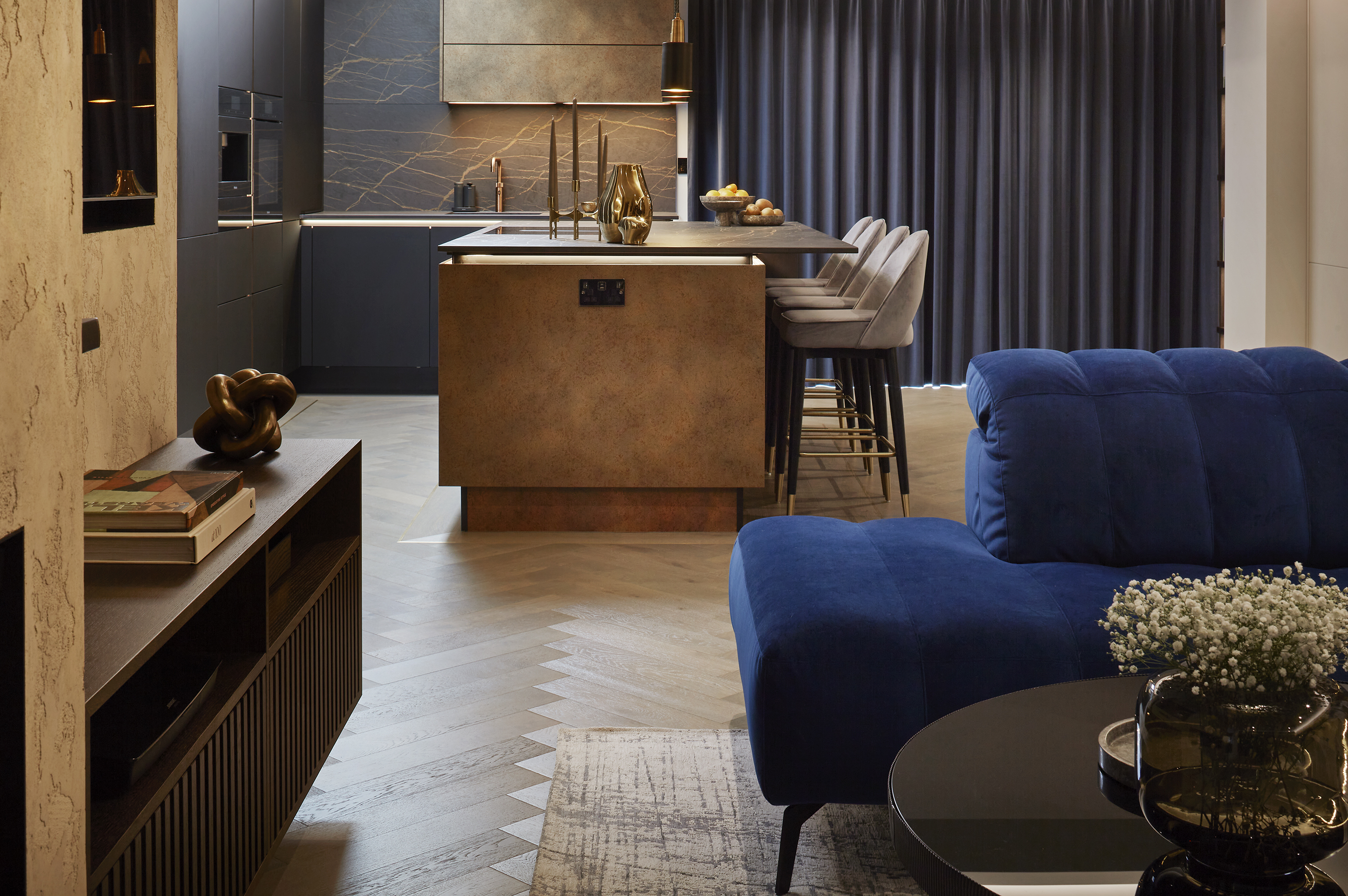 Adding a striking element to the space, Havwoods rich Ebony Ondato Elegante Vaneer panelling provides a sophisticated backdrop which complements the overall elegance of the interior design. The deep blue sofa perfectly contrasts with the dark brown feature wall, whilst the gold accent further enhances the luxury aesthetic.