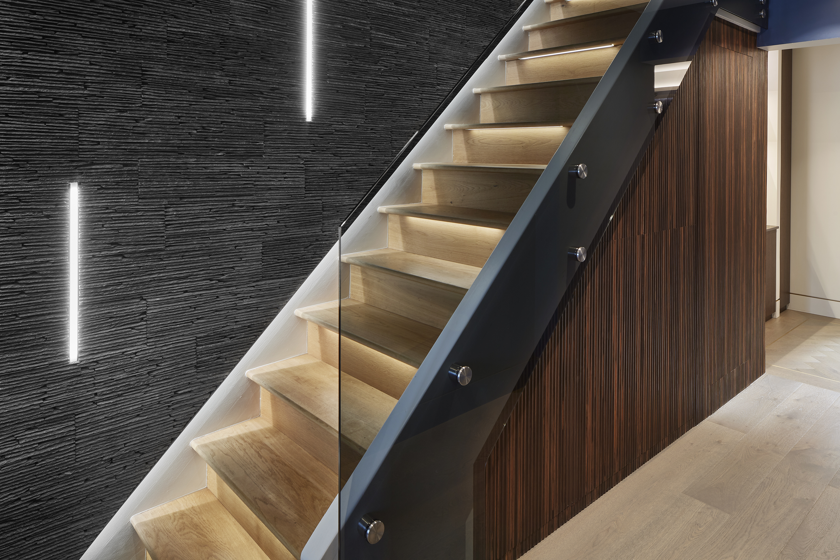 The Rothbury 1-Strip has been used in the hallway in order to elongate the space, whilst the living room features a striking Herringbone design, which creates added interest. The textured dark brown Elegante Vaneer has also been used for the staircase wall, continuing the design through from living room to hallway.