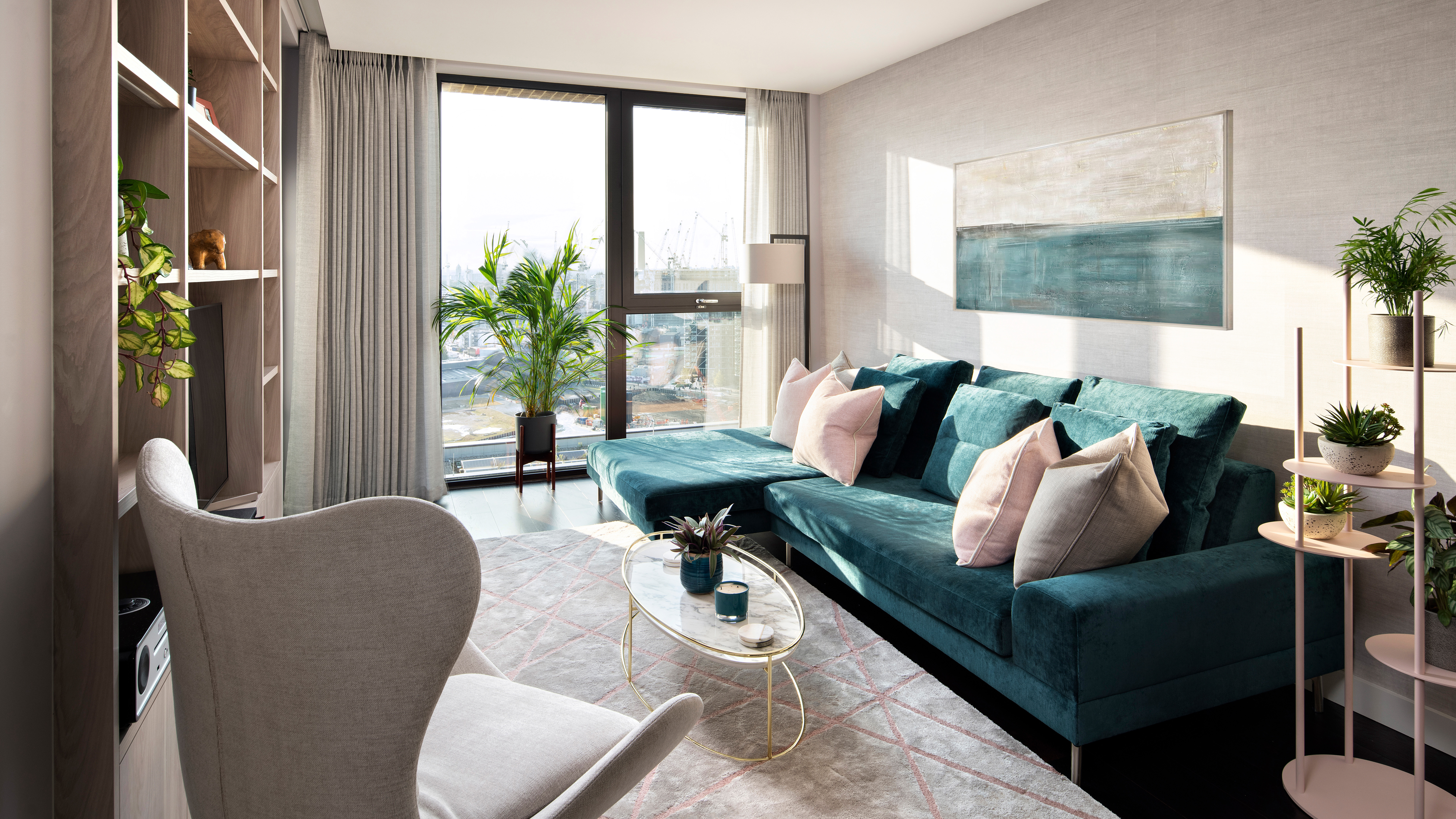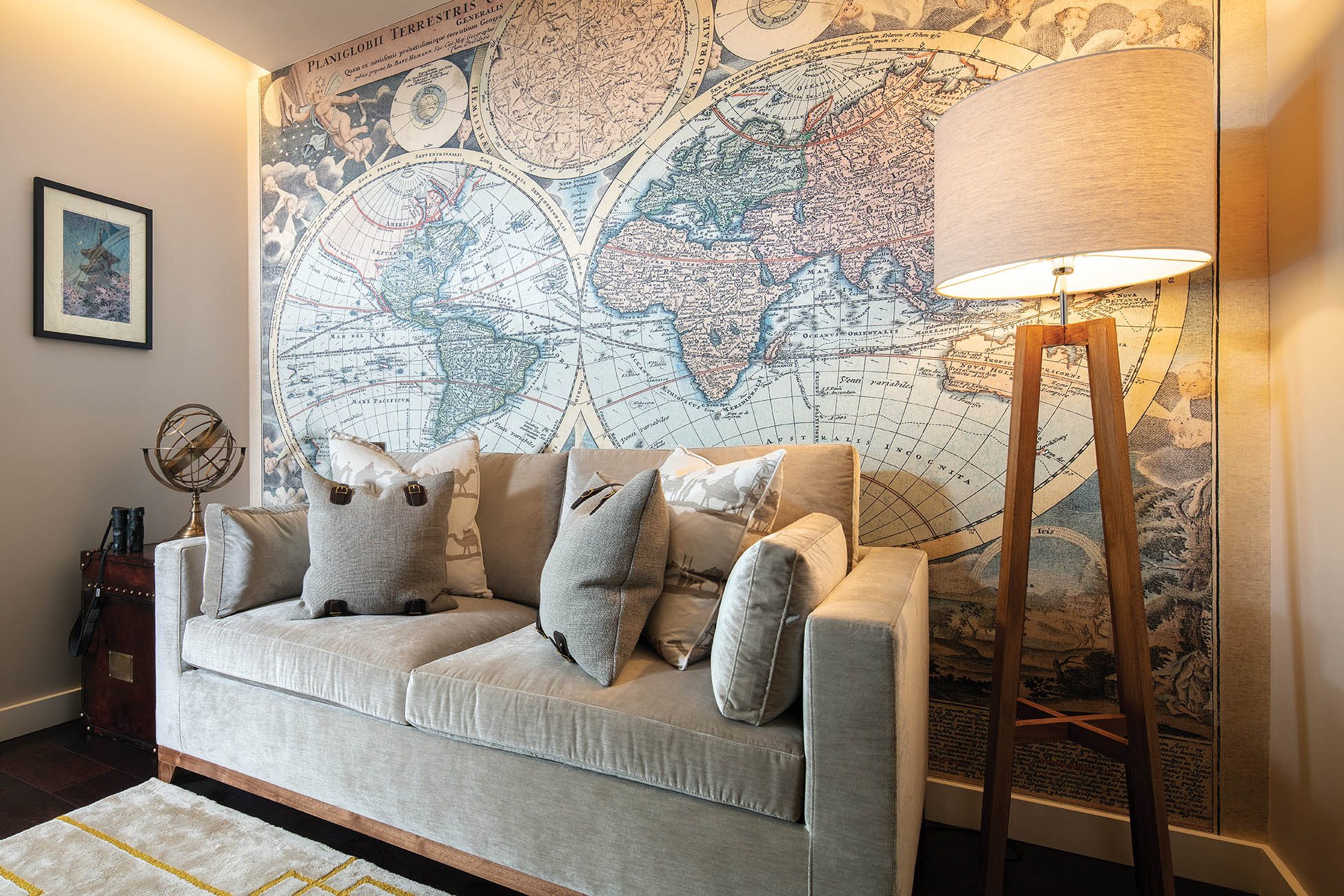 Our client had purchased a new development flat with commanding views of the local area and wanted to live in a new home with a stylish and classy luxury interior design. At Moretti Interior Design, we believe it is essential to include the lighting design for your interiors into account from the start of the creative process – as we did in this case. We also use colour psychology to ensure that the look and feel of each room is perfectly suited both to the character of the people who will inhabit it and the function of the room in question. In this instance, our client wanted a contemporary style with a hint of the 1960s and 1970s. To complement this process, we designed several bespoke items for the client. That included the wallpaper, headboard, rugs, the TV unit and office chair. That ensured the client could move smoothly into a new home with an interior design that epitomised their individual taste and style. That process was exemplified by a room that we created where the interior design reflected the client’s love of travel. We came up with an explorer theme, crowned by a stunning map of the world that filled a whole wall of the room.