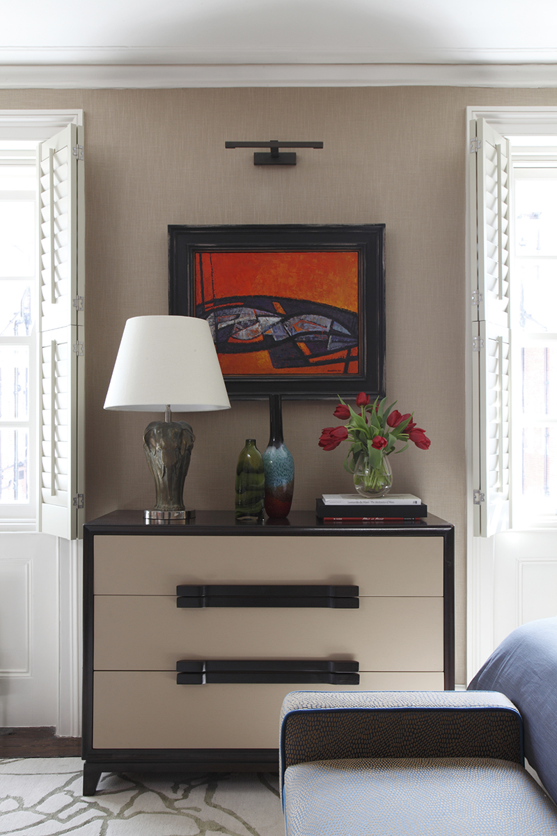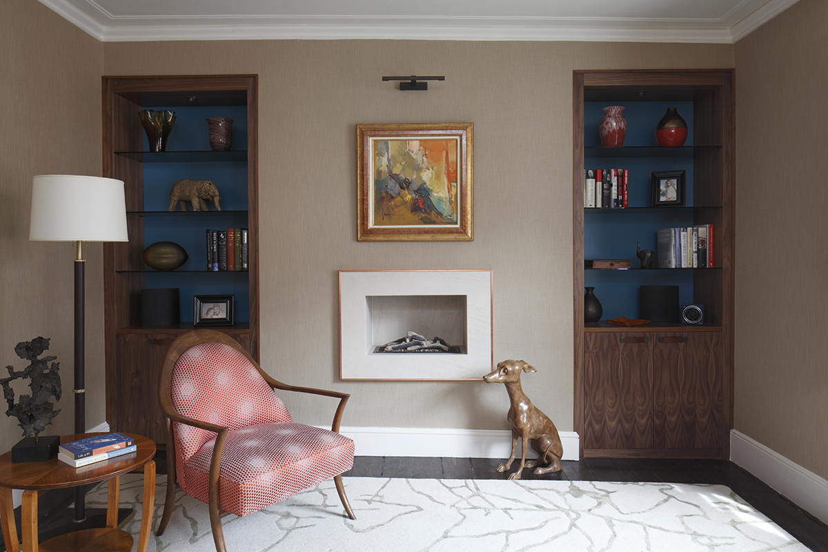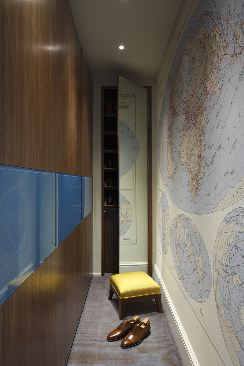 Bespoke elements were introduced including unusual materials and pieces, such as the giant air route map wallpaper, blue lacquer, walnut and smoked glass joinery, polished black nickel brassware and copper detailing on the stone fire surround.