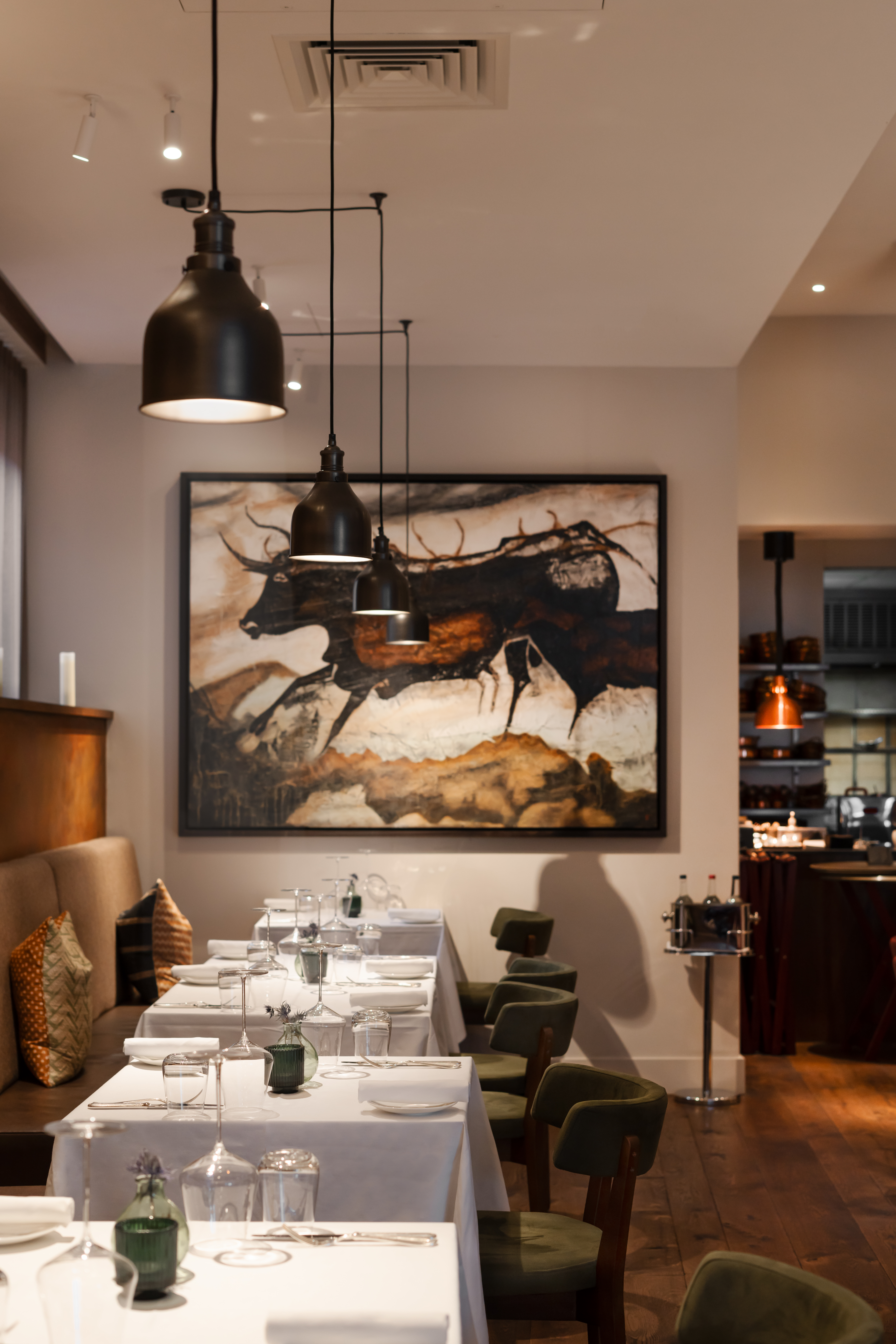 “Working with Industville gave us the flexibility and choice to customise the lighting, helping to achieve the right atmosphere for a variety of dining scenarios throughout the day. We selected different sized pendants to give variation and definition to the space. For instance, a bigger fitting with a chain addition to the flex and copper inside the shade complimented the large table that has a U-shaped banquette around it. We could choose to line the shades with different metals which added a further layer of warmth increasing the overall ambience - this worked particularly well above the bar, where the copper inside really caught your eye delivering an inviting glow, whilst connecting visually as a link to the chef’s station. In design it’s all about the detail, and being able to use LED bulbs that were compatible with dimmer switches ensured the space stays welcoming at all times of the day.”