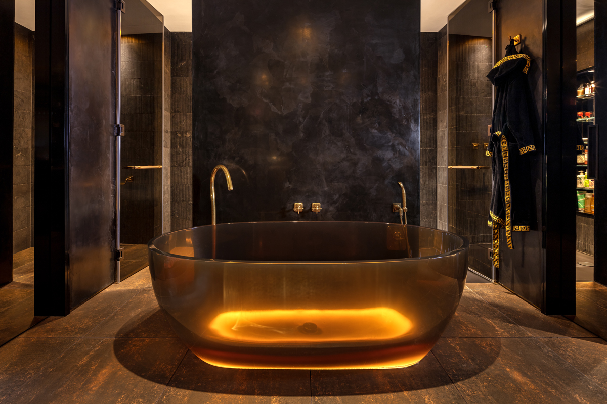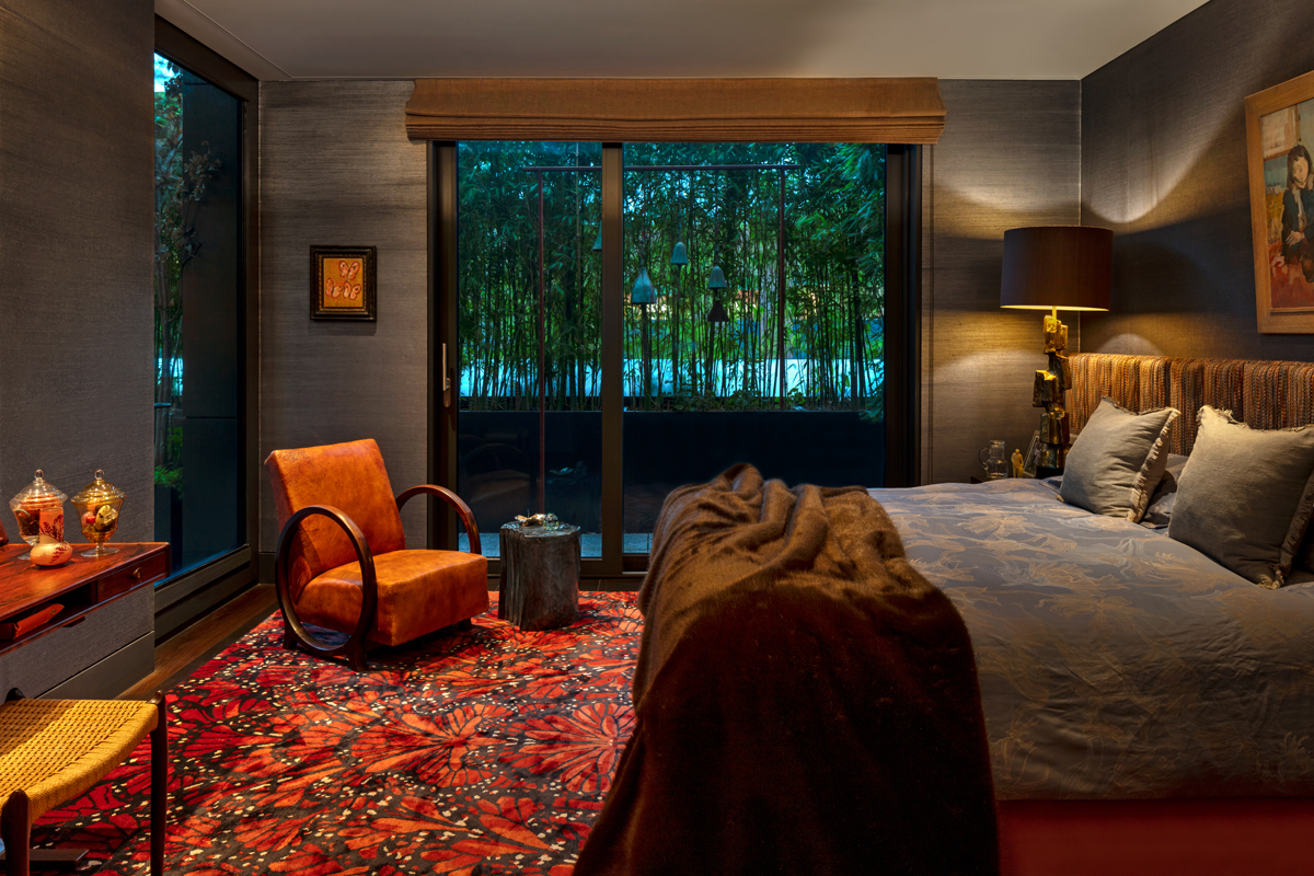 As well as communal and entertaining spaces, the couple required a set of rooms that they could retreat to and call their own. The space allocated for this was long and narrow and yet had to accommodate a library, an extensive dressing room, a bathroom that could be classed as a leisure space, and a bedroom. We achieved this by interconnecting the rooms with double doors that could be left open to create the sense of space or closed to create individual sensuous jewel boxes that could delight in their own right.