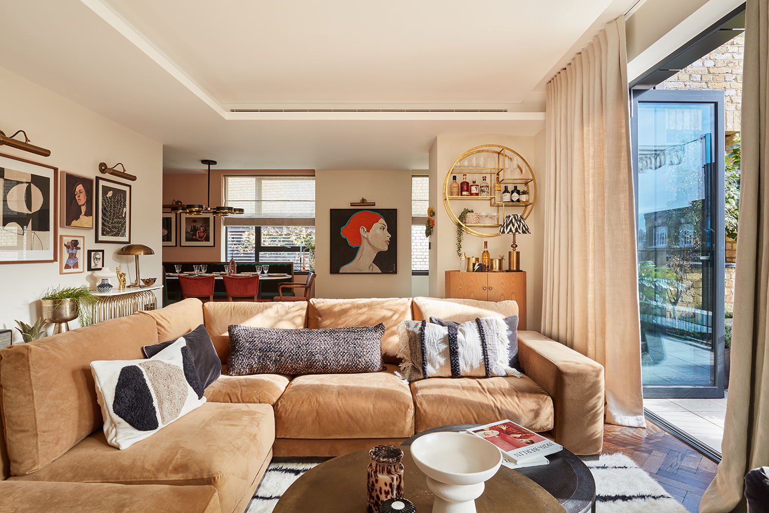 When we were tasked with the project, the sub-penthouse had been fitted with a new kitchen and bathrooms (which didn't need many updates) but was completely unfurnished with minimal lighting. The clients set an exciting brief, to turn the light-filled shell into a showstopping London boutique hotel inspired home from home, designed around cocktailing and entertaining, furnished and styled into a dynamic, maximalist interior scheme oozing with character, vibrant tones, pattern and interesting textures.
