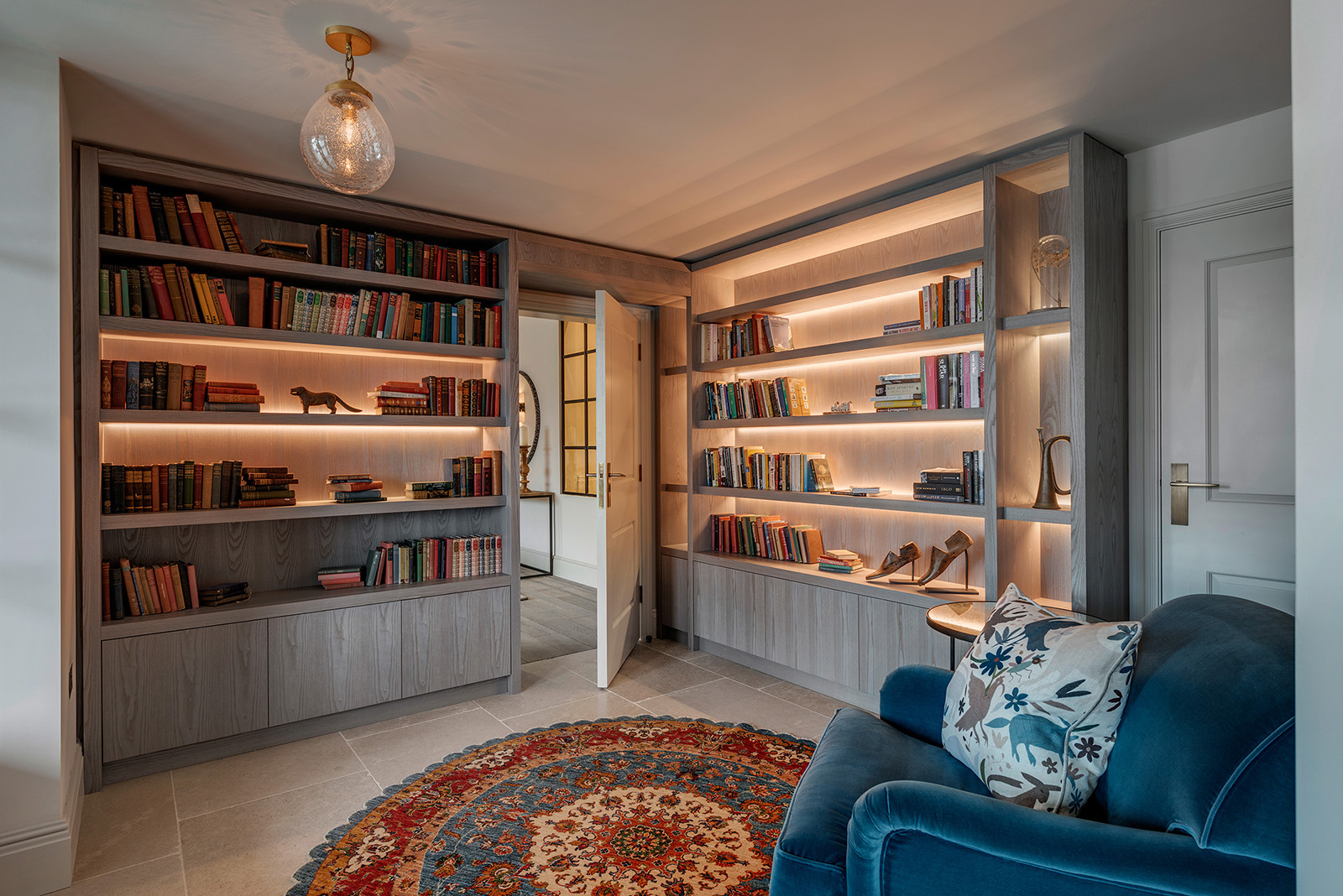 Using local suppliers for the bespoke kitchen and joinery, soft furnishings and hand-forged curtain rails and stair banister. All the bathrooms have been individually designed with hidden storage and subtle lighting to achieve a 'spa' like feel. Natural stone compliments matt white basins with taps and shower heads in nickel plate. A library area houses the client’s collection of books and objects, there are both formal and informal reception rooms as well as a stunning conservatory overlooking the water. We sourced exquisite antique chandeliers and vintage decorative items to offset the more modern elements of the scheme to give the house a relaxed lived-in feel. We also worked with local art galleries to acquire a number of pieces of artwork, ceramics and sculpture to compliment the scheme, all resulting in the cohesive interior the client and the Cornish Interiors team were aiming for.