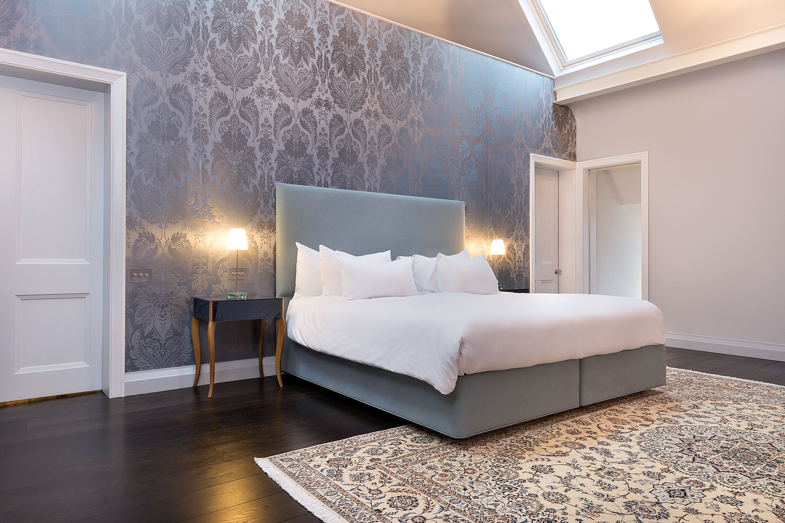 With such dark floors in the bedroom, we placed a gorgeous light based Persian Nain in the master bedroom. It keeps the room nice and bright and with its silk details, adds a bit of luxury to the space.