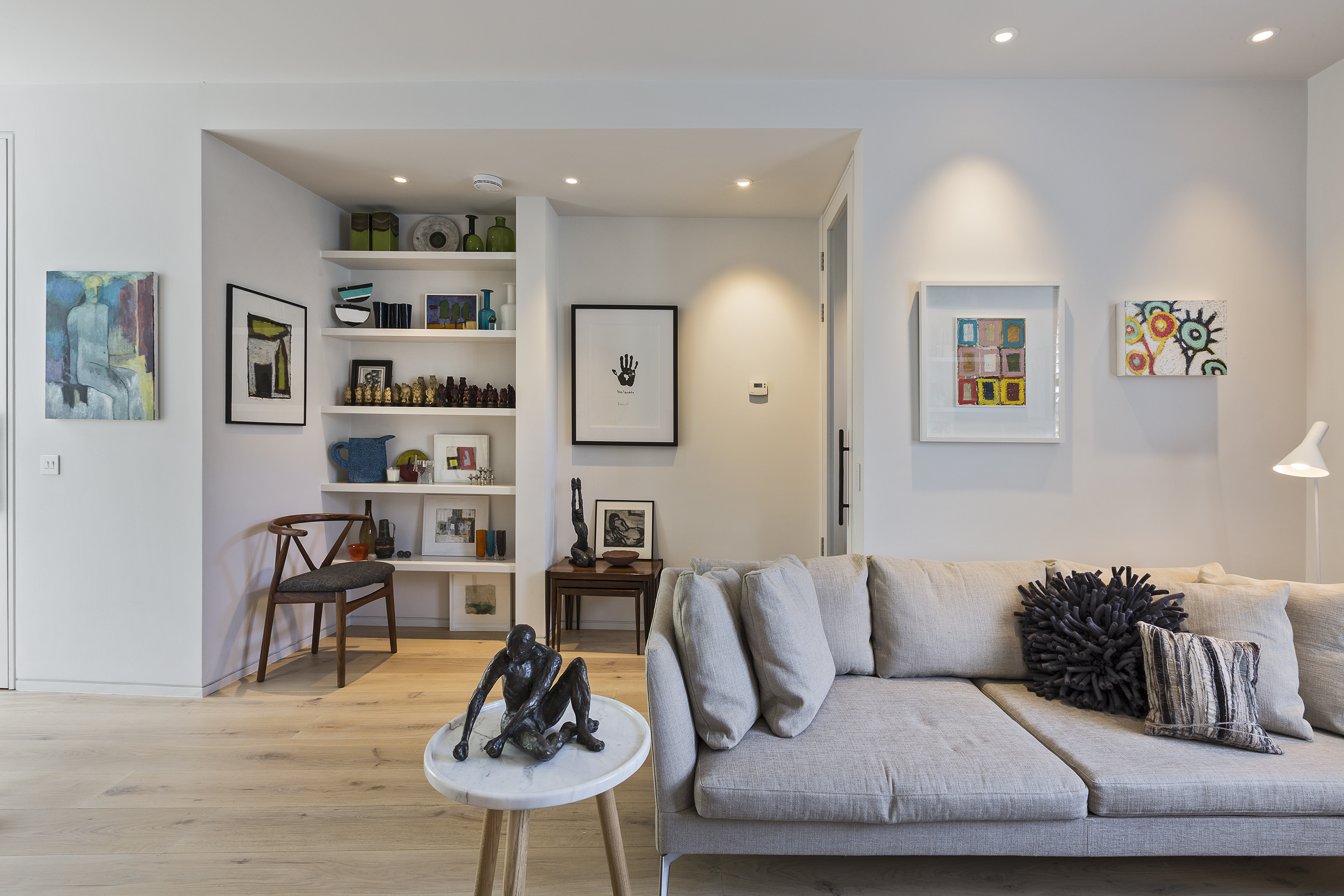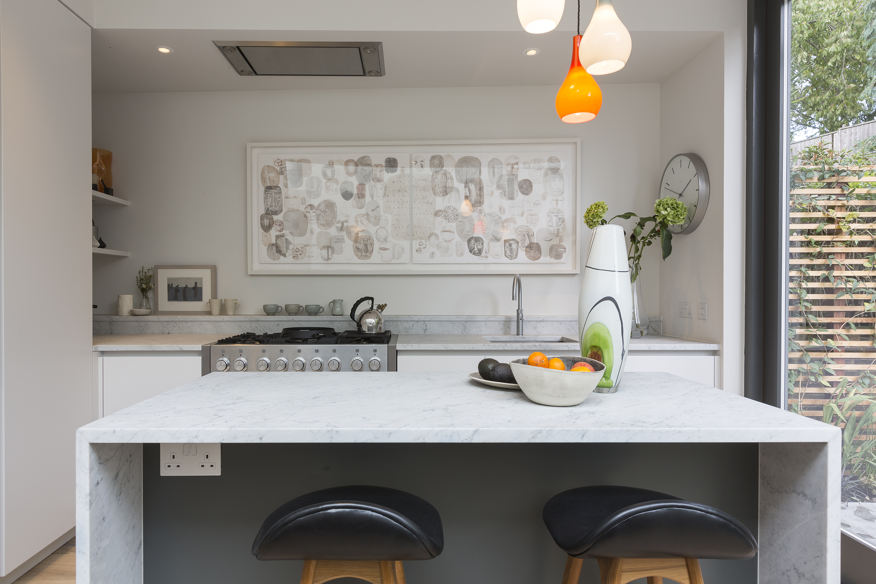 The whole of the ground floor was remodelled into one open-plan living space, from front door to rear garden. The stair was shifted transversely to form a strong architectural feature, with a roof light above bringing light into the middle of the living area.