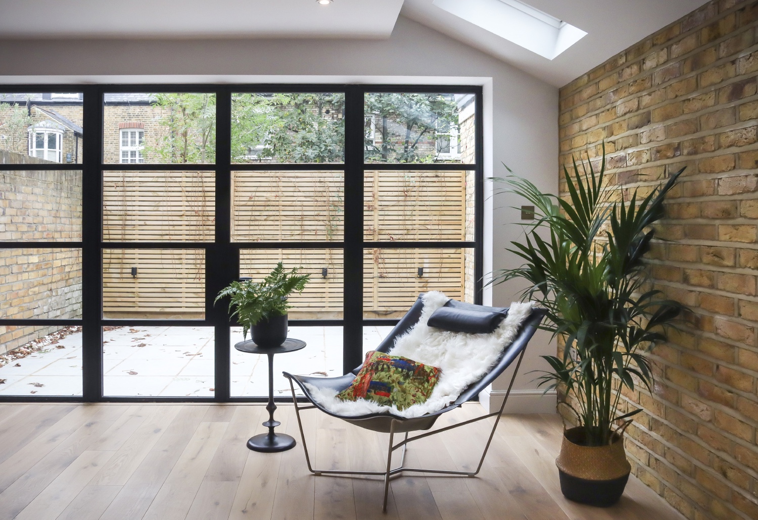 The ground floor flat has two bedrooms and two bathrooms, and an open plan living and kitchen area in the new extension with a wall of Crittall windows leading to the patio garden. The extension also created a small side courtyard area allowing light and views into the dining area and is accessed from one of the bedrooms.