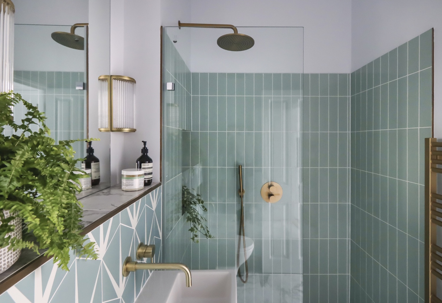The bathrooms use a more muted palette of colours and textures, but the eclectic mix of tiles continues the character of the more colourful versions on the ground floor.