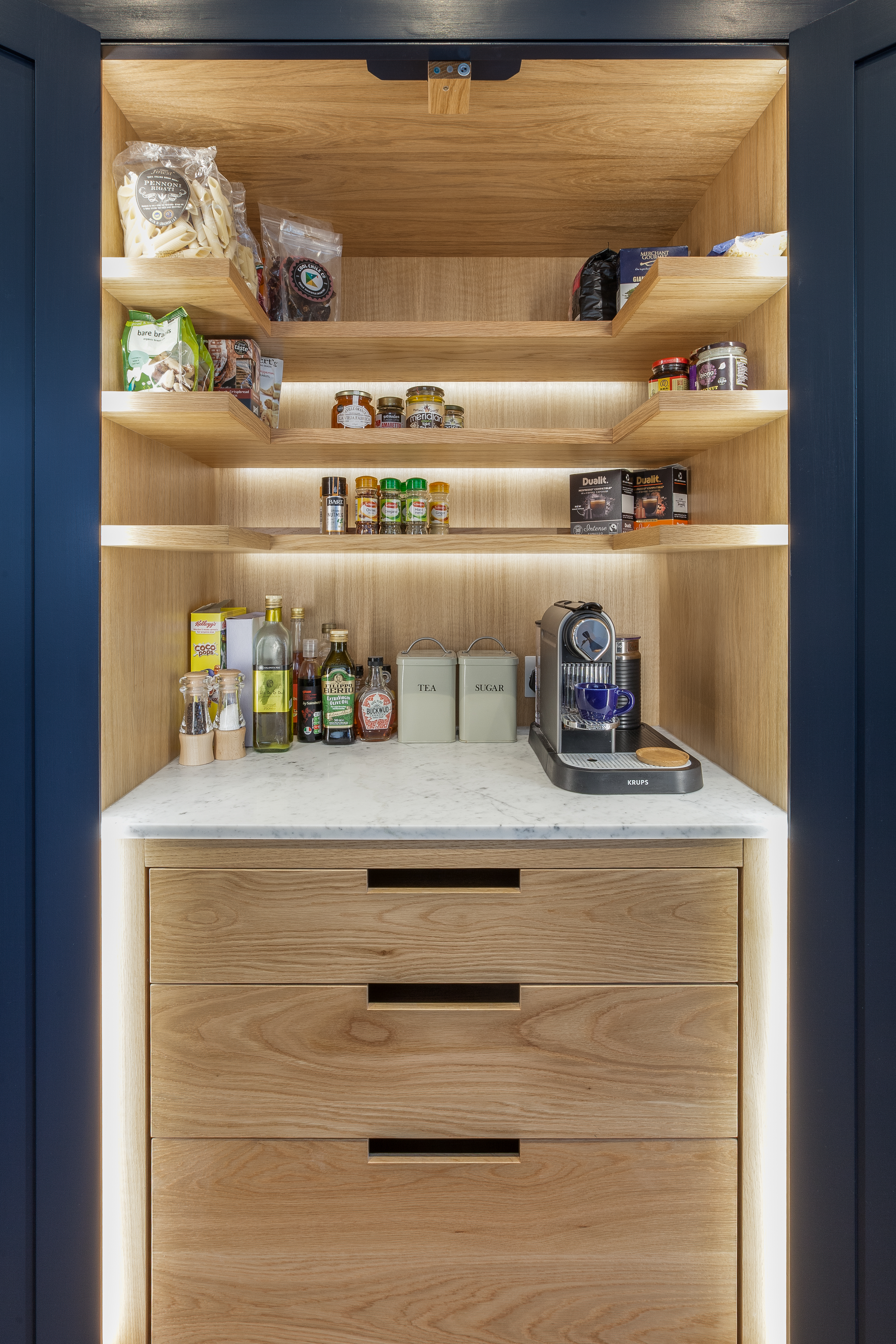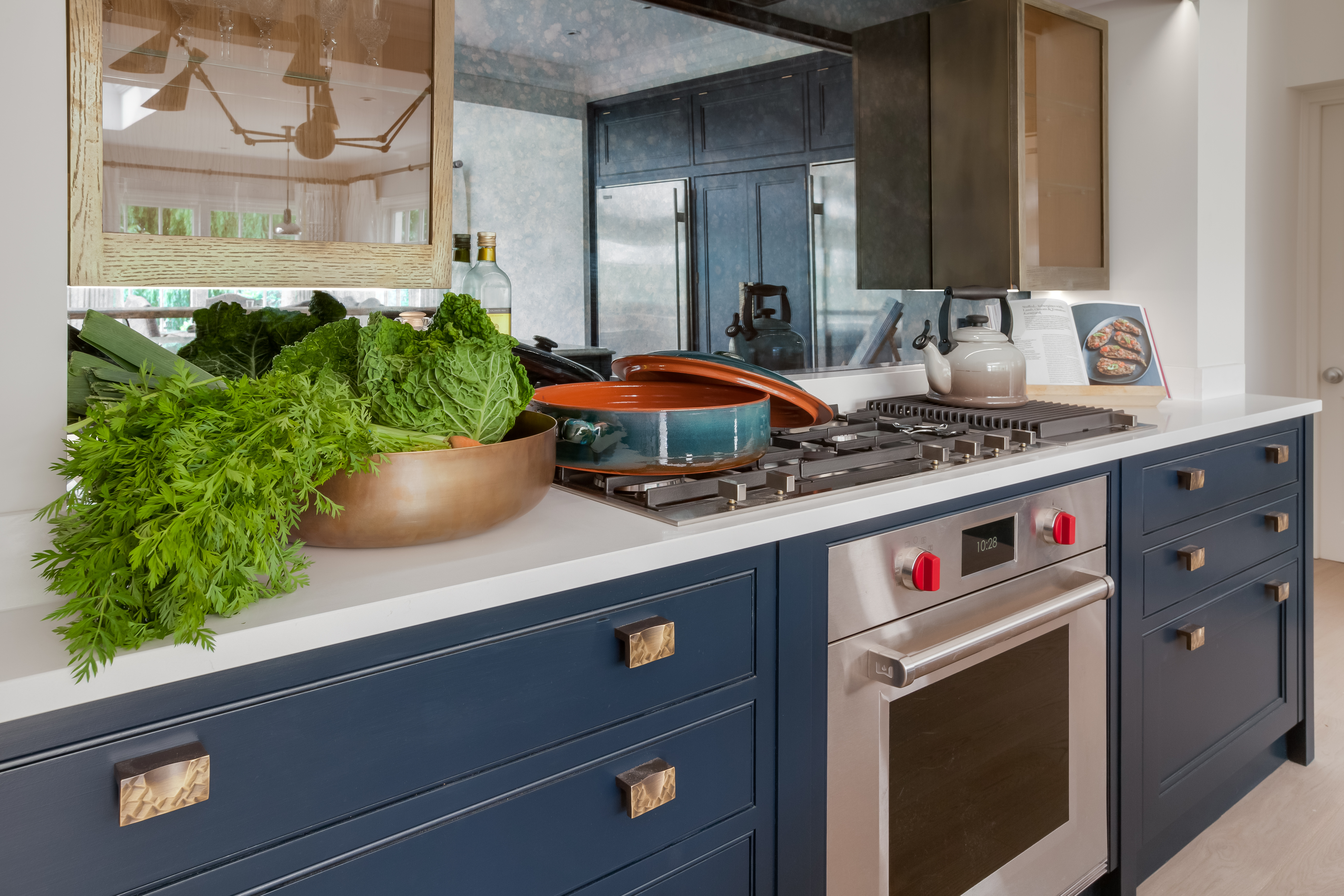Traditional bespoke In-frame wooden kitchen. Painted in Basalt blue from Little Greene Paint Company. Worktops in Calacatta Marble. Antique glass splashback.
