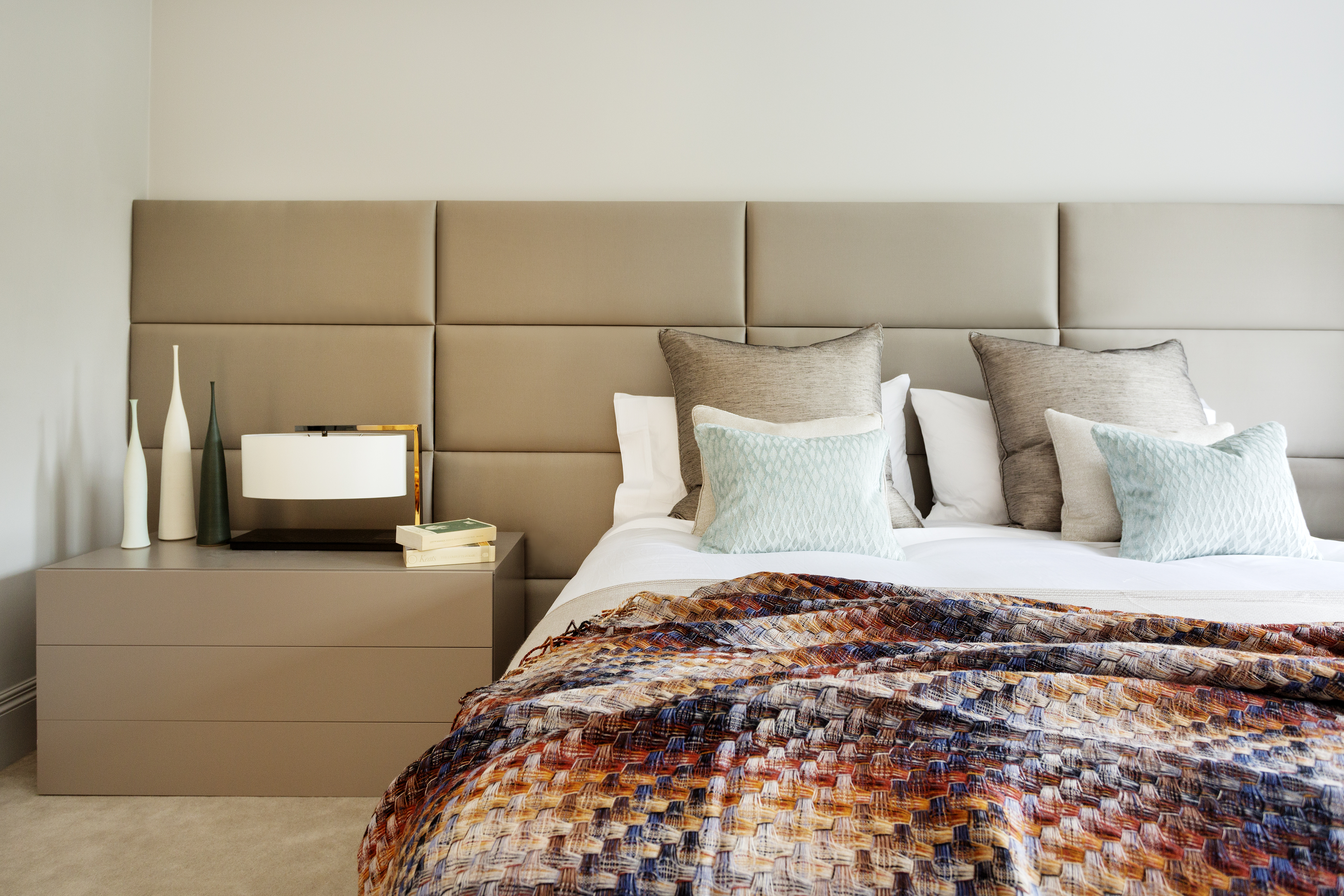 Dramatic lighting was also key, so we selected two coordinating sculptural hoop pendants and multiple spherical glass lights which were hung throughout the interconnecting rooms. The dark walnut veneer & satin smooth cappuccino spray-painted units of the kitchen are given extra depth by the contrasting bronze steel splashbacks. The unique dining room bar joinery design is stylish, contemporary and warm. Upstairs the master bedroom headboard spans the entire wall and opposite a 3D feature wall conceals the TV. In the bathroom we went for a modern luxury spa feel with a deep oval bath and design-led brassware. The finale was the impressive office which was opened into the eaves above a mezzanine level with a spectacular double-height wenge bookcase with bronze railings and ladder as a feature. The overall effect is of a contemporary, sleek family home where every room is enjoyed to the max. Thanks to HUX for the fabulous kitchen, panelling and joinery throughout.