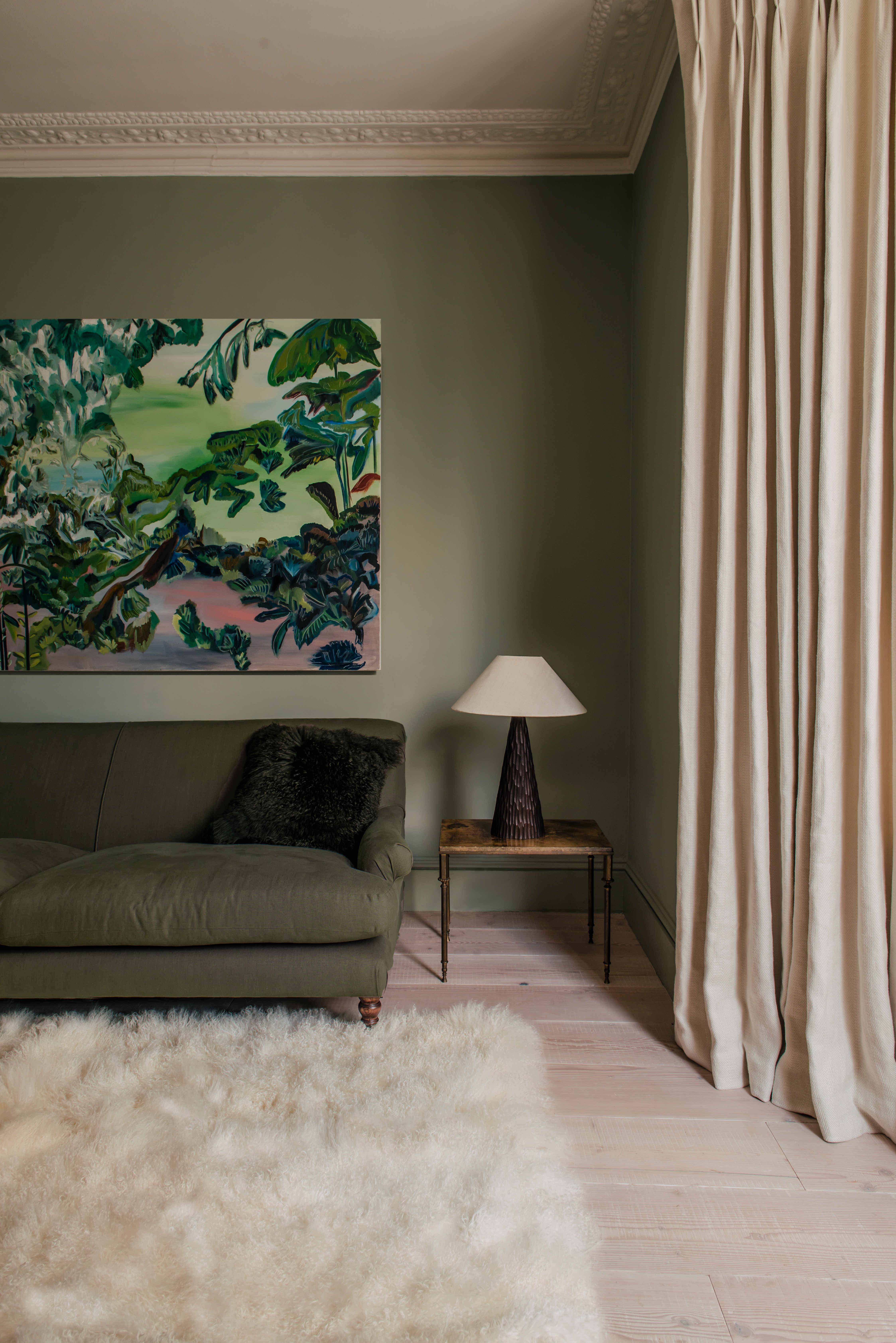 Bright palette modern extension in Victorian townhouse set over two floors. Douglas Fir floorboards with linen & boucle and lime-washed walls with antique limestone slabs.