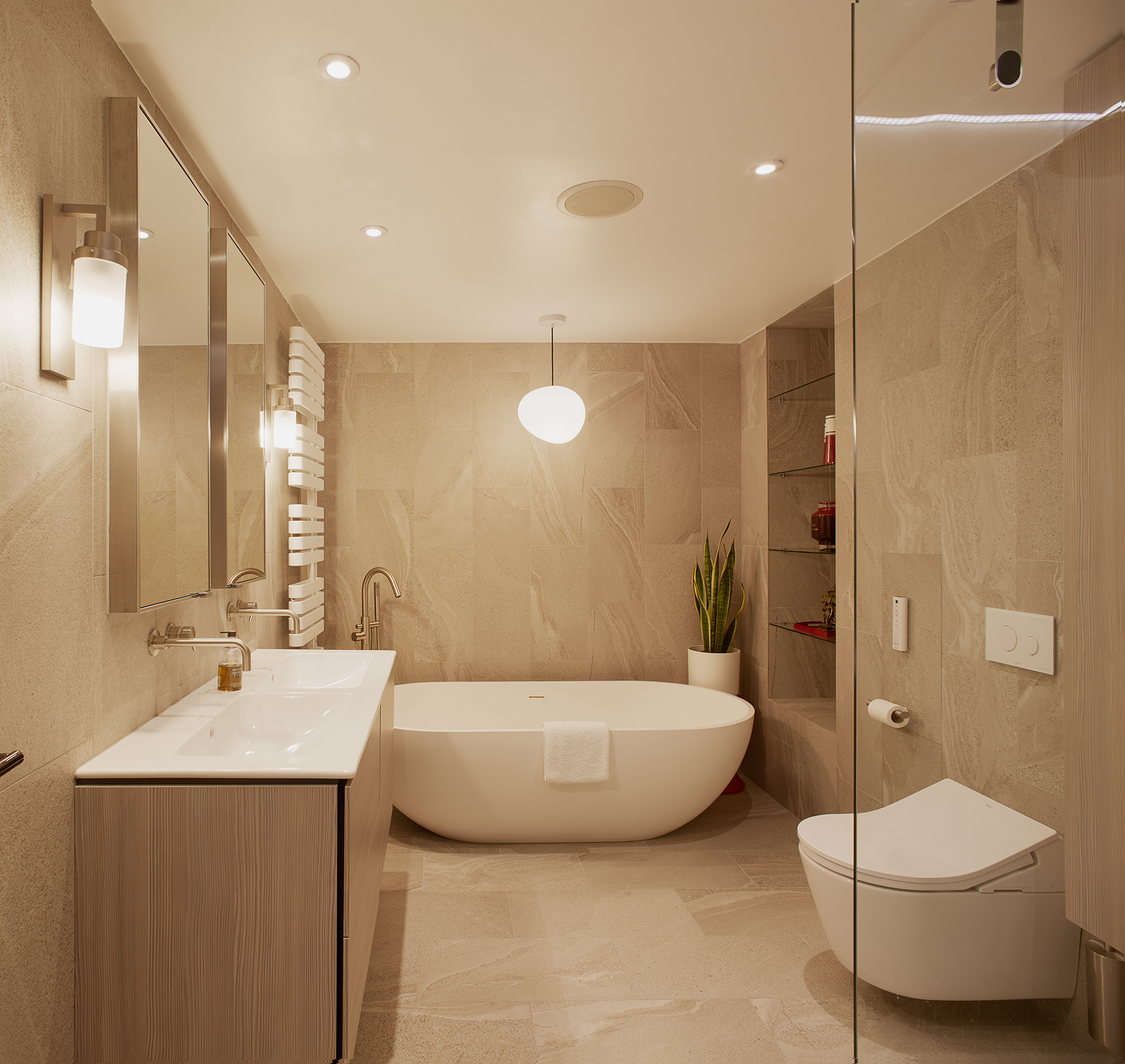 Our client bought this property a couple of years ago. The interior remained? mid-2000 when it was built. The awkward layout was the result of subdivision of a 2 storey penthouse apartment. The narrow kitchen was completely separated from the rest of the apartment, the living room had an unusable nook and the master bedroom had 2 small tiny ensuites. We concentrated on addressing these areas first. We created an open plan kitchen/dining/living room, private study and master ensuite with freestanding bath and double shower.