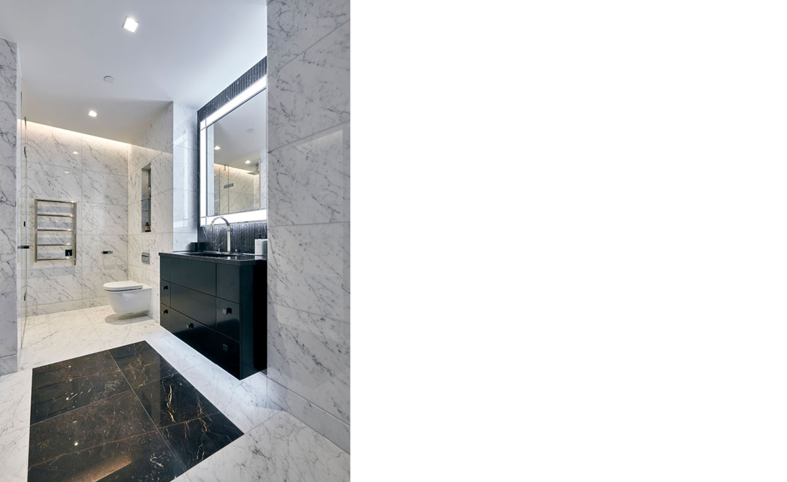 Providing a cooler appearance, 3200K lighting was selected for the bathrooms, lifting the space and deilivering a vibrant appearance. A strip Ledline was incorporated into the shower shadow gap and concealed under the vanity unit for a hint of discreet extravagance whilst a bespoke back-lit mirror radiates a feeling of elegance.