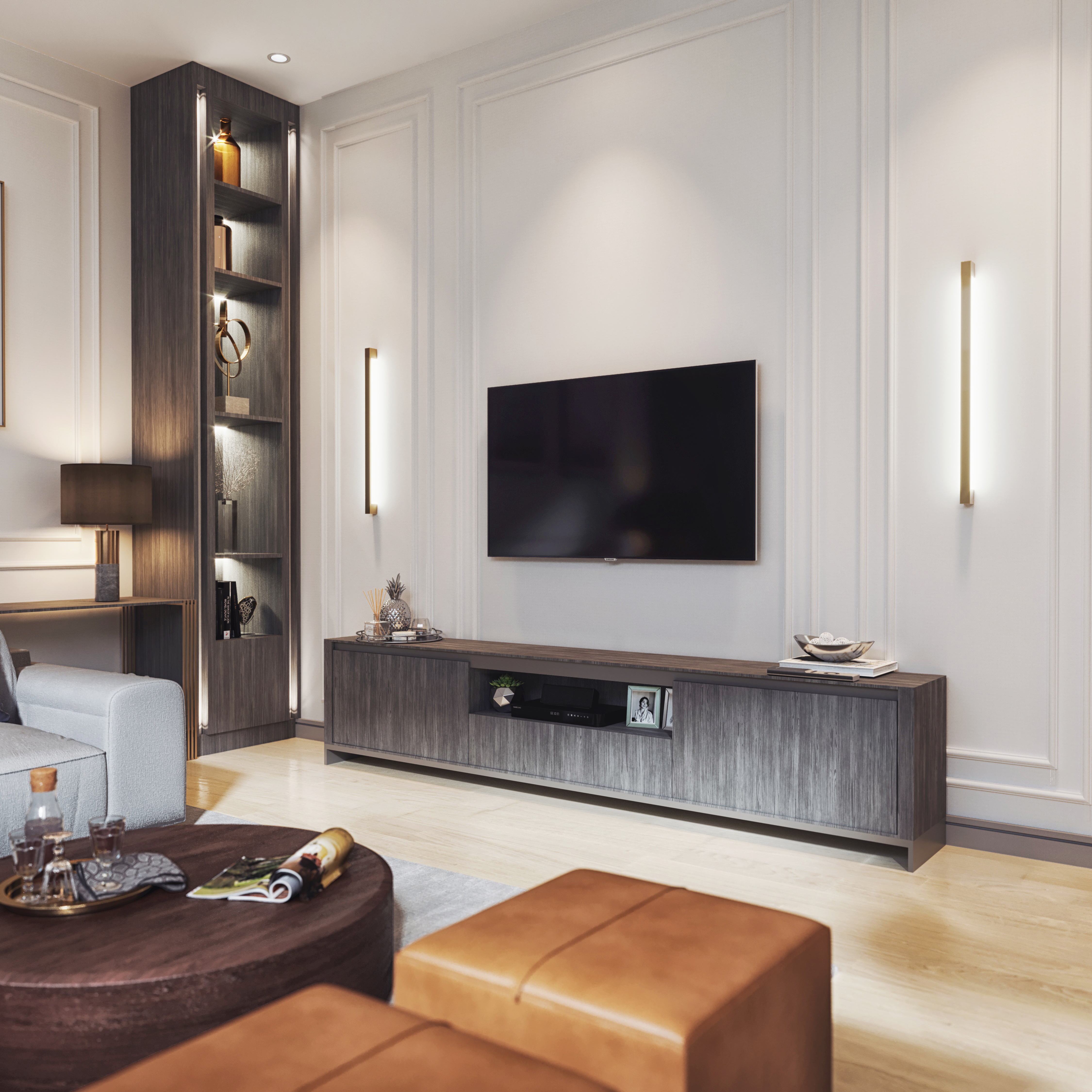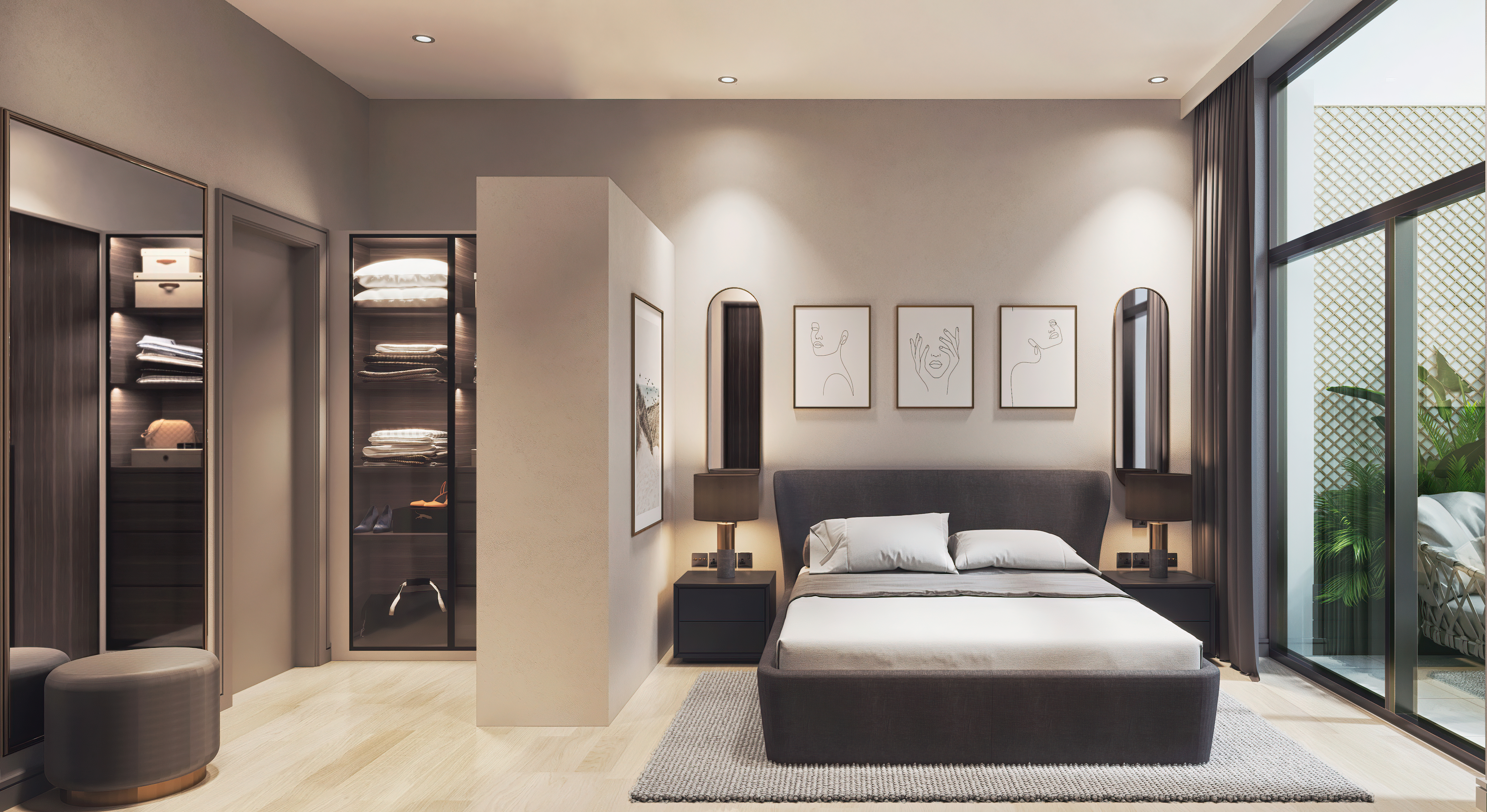 In the bedroom, we designed a functional layout that sections the space for both sleeping and getting ready. The wall shown in the image is a built-in wardrobe that flows seamlessly from the adjacent unit, featuring metal and glass details with a veneer interior. We selected a neutral and woody colour palette, and the bed, mirrors, bedside tables, and wardrobe are all bespoke, maintaining a cohesive look that complements the rest of the apartment.