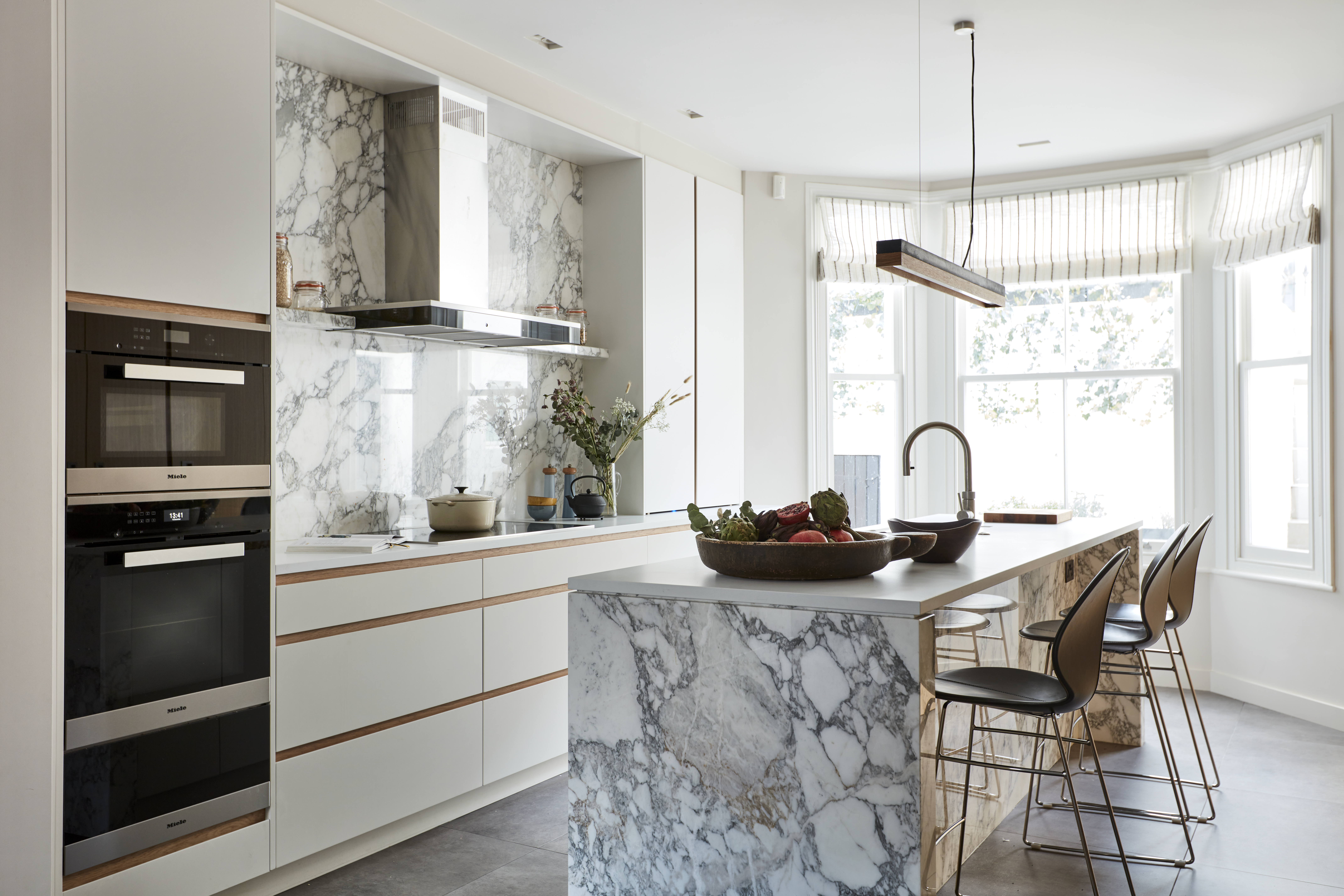 Belgian architect Ramses Frederick designed the kitchen extension in the basement, which added about 40 sqm of floorspace to the house. The bespoke kitchen was realised by Anthony Mullan and features beautiful Calacatta Vagli worktops and backsplash, solid oak units and Miele appliances.