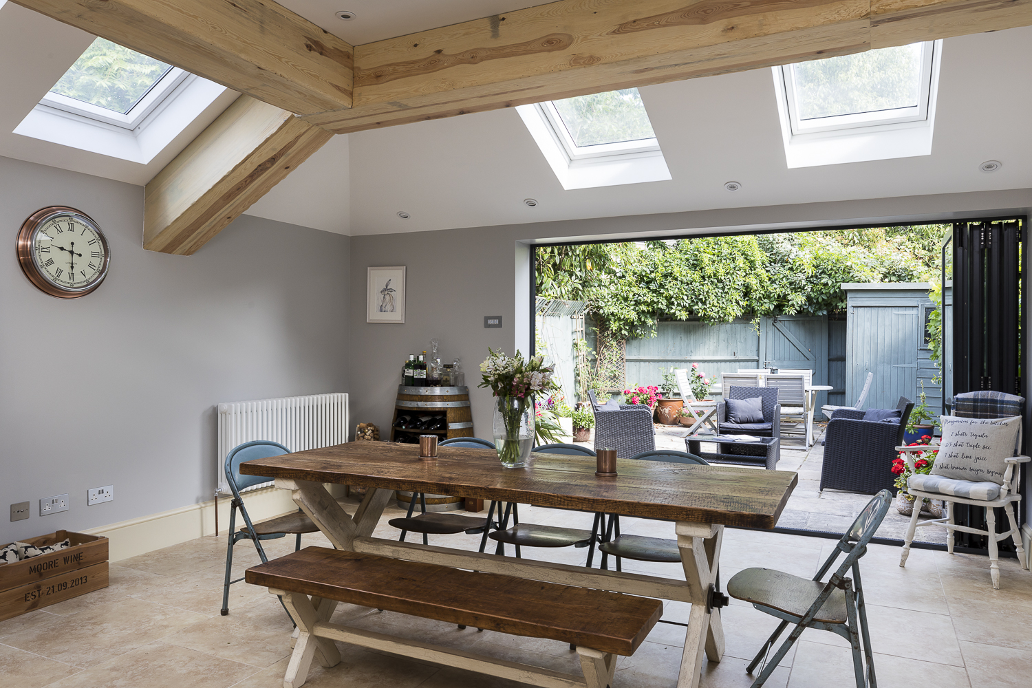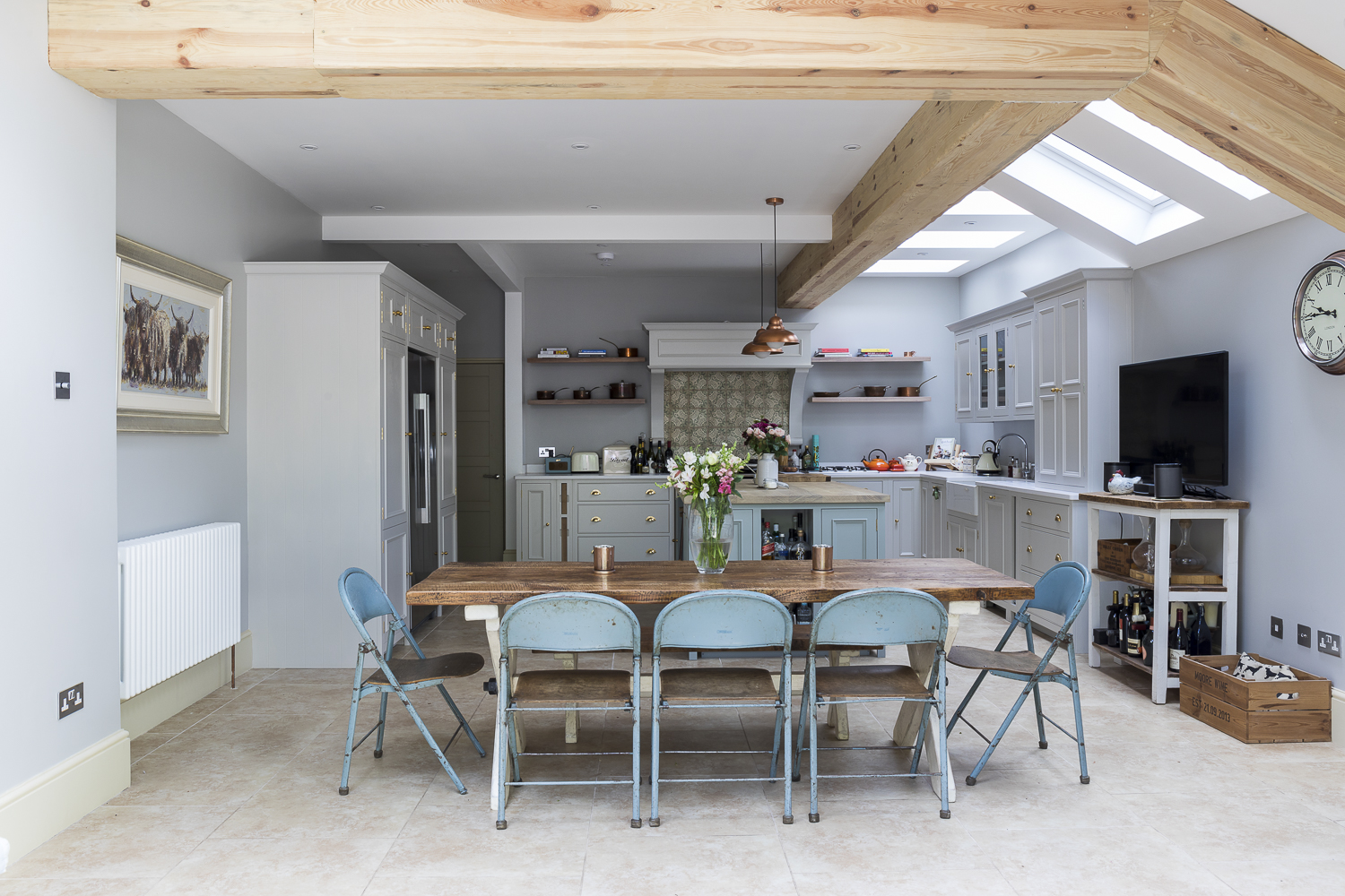 The new extension houses a large kitchen by Neptune with cabinets in two colours, a traditional Aga cooker and a dining area. Folding glass doors open onto a redesigned garden.