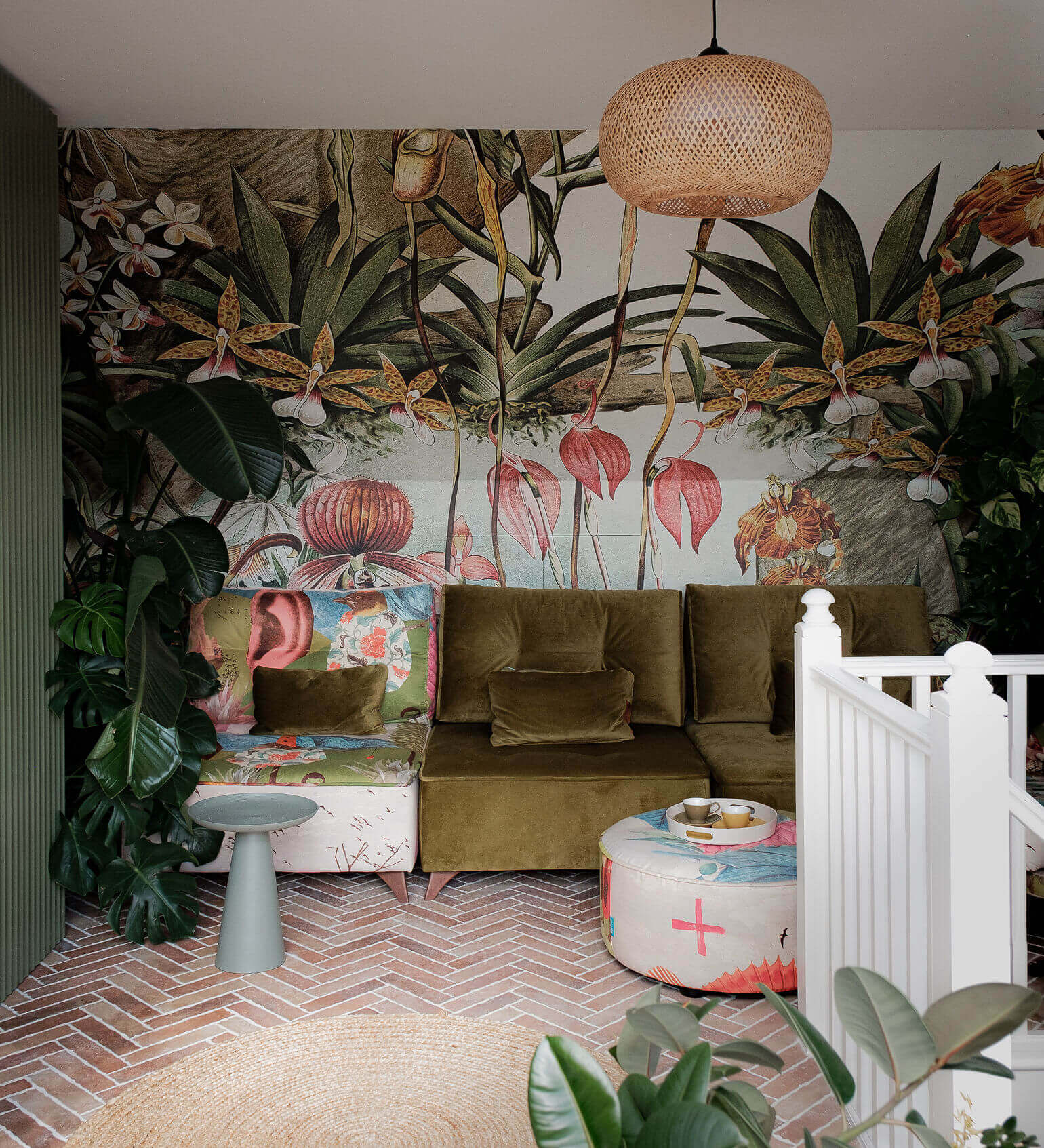 For fabric dyes and paints, I needed to ensure bleaching from the intense sunlight wouldn't happen. Where tall kitchen storage had previously been, a desk area was incorporated and as the boiler couldn't be moved - it was disguised within bespoke joinery. Useful eaves storage was also added. The exposed brickwork was kept, minimising the need for additional materials. The skeiling felt like it needed to be decoratively treated to include the short wall below. My clients were happy for this to be bold lush leafy mural, with a slightly clashy lush print on the modular lounge seating below. Coupled with rattan and seagrass woven finishes and a beautiful terracotta tiled floor laid in a herringbone pattern (which will extend onto the roof terrace in the next phase), it's worked out really well.