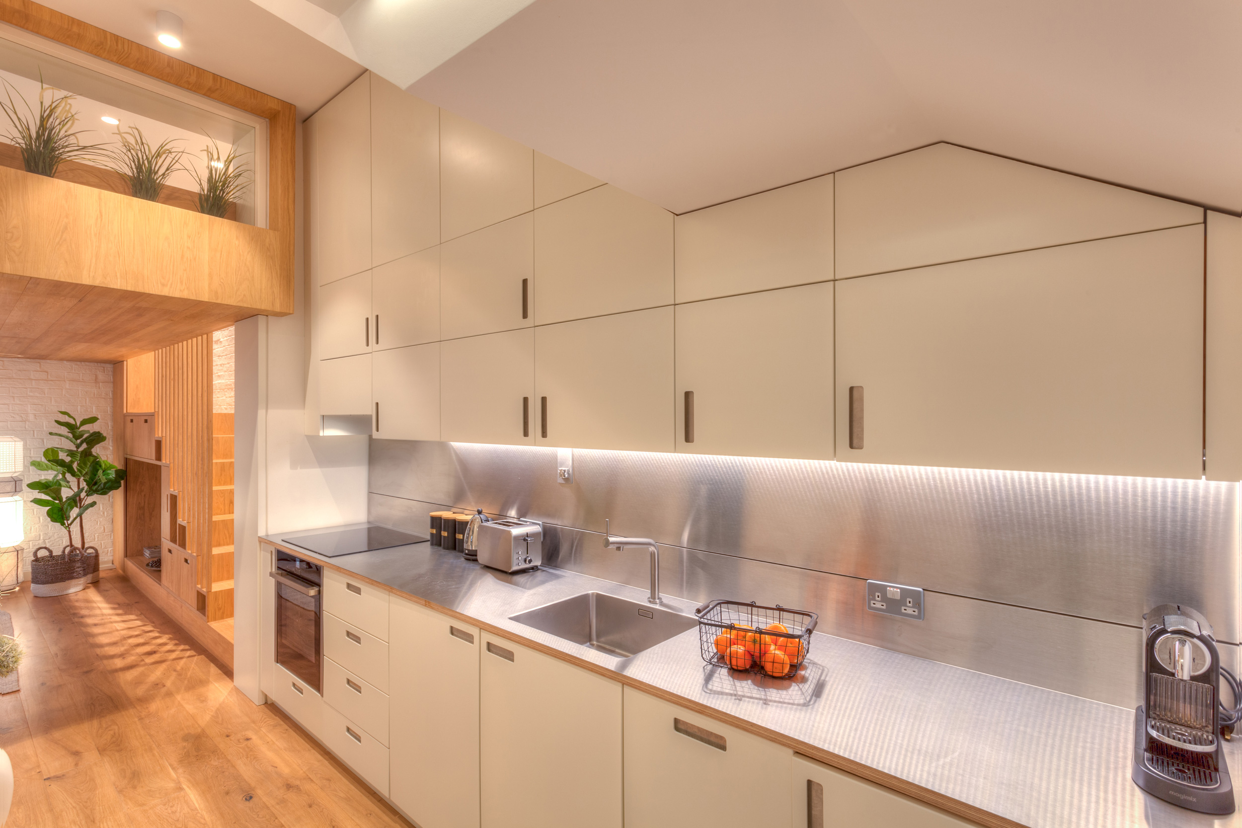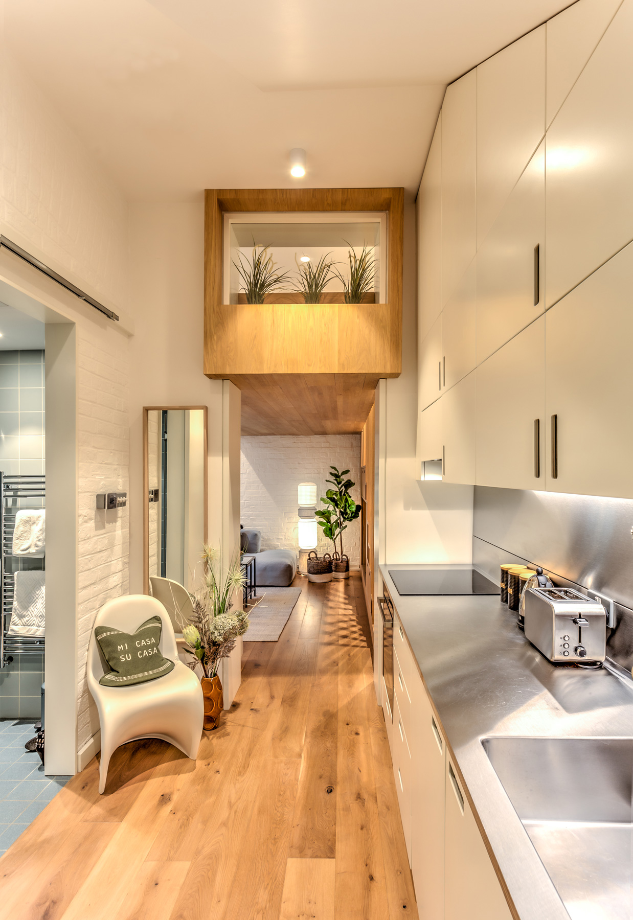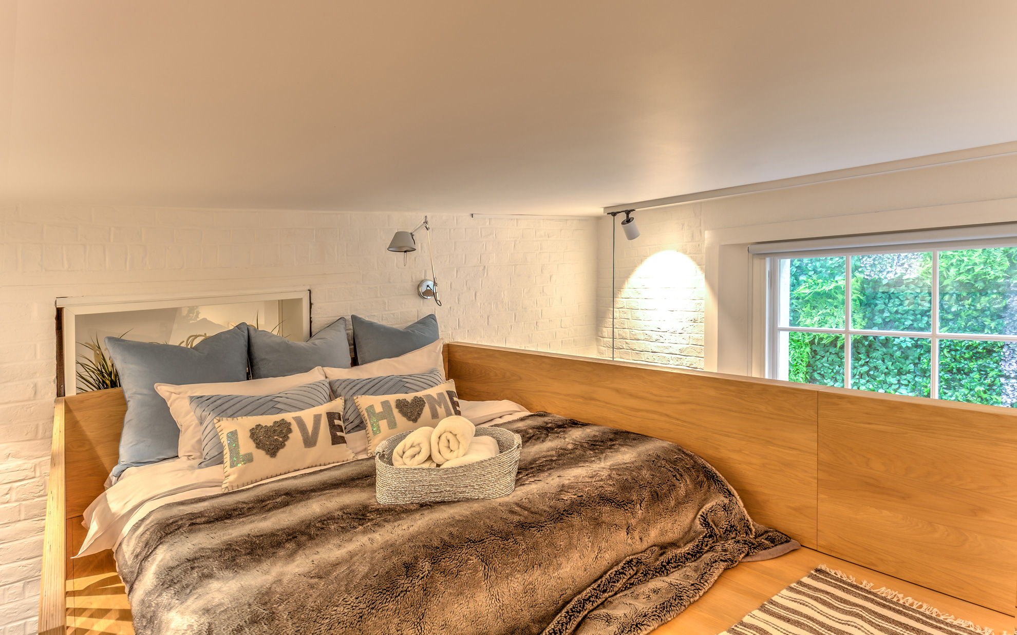 This studio flat in Gloucester Road was destined as a holiday let. The interior decor complements the contemporary Scandi character of the space. Large sofa from Danish company Hay adorned with richly textured tribal cushions invites to put your feet up and relax. Media unit has been built in the staircase leading to the mezzanine sleeping platform above.