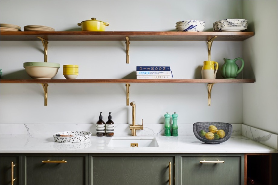 Bespoke joinery was designed and built throughout, including the kitchen. This was handmade in our workshop and was constructed of Ash door fronts, with the inside of the cabinetry finished in Walnut. A rich Calacatta marble was sourced for the worktop, with the subtle hints of gold and green in the stone being reflected by the brass handles and green of the overall scheme.