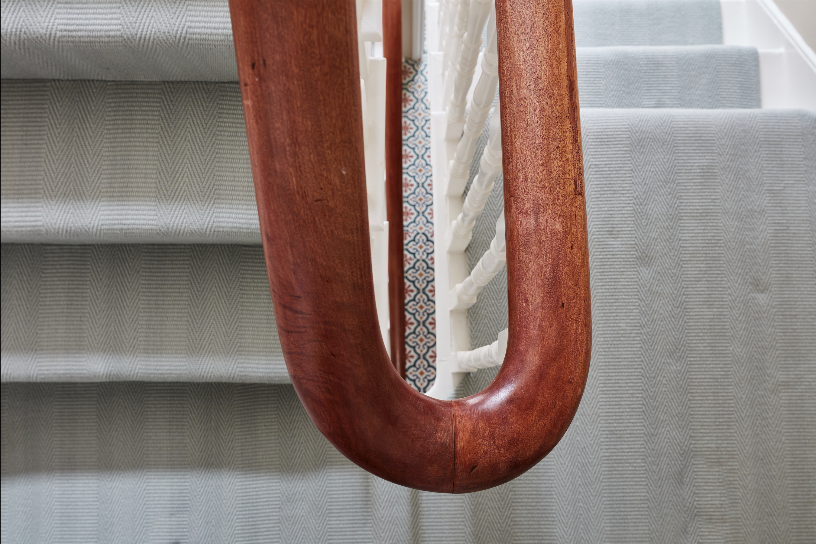 Some alterations were made to the layout, reconfiguring bathrooms and creating a new utility / WC area on the ground floor. Structurally, a new staircase was also designed and installed. The previous stair incarnation had dated, mock Victorian spindles. Huntsmore proposed contemporary black steel spindles with a slimline oak bannister running top to bottom. These black spindles were complemented with a green and black Roger Oates stair-runner and an off-black 'Fern' wallpaper from Little Greene.