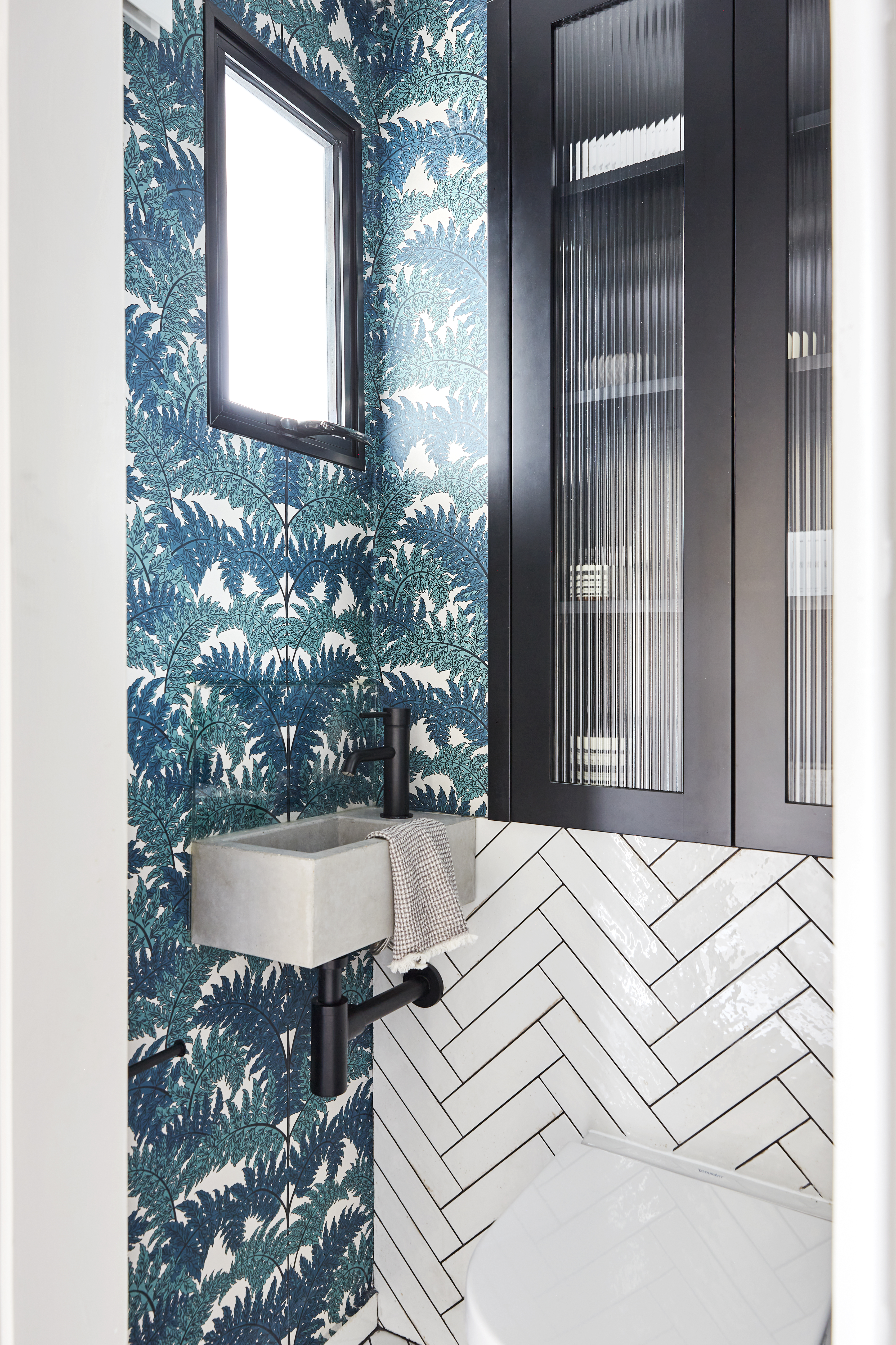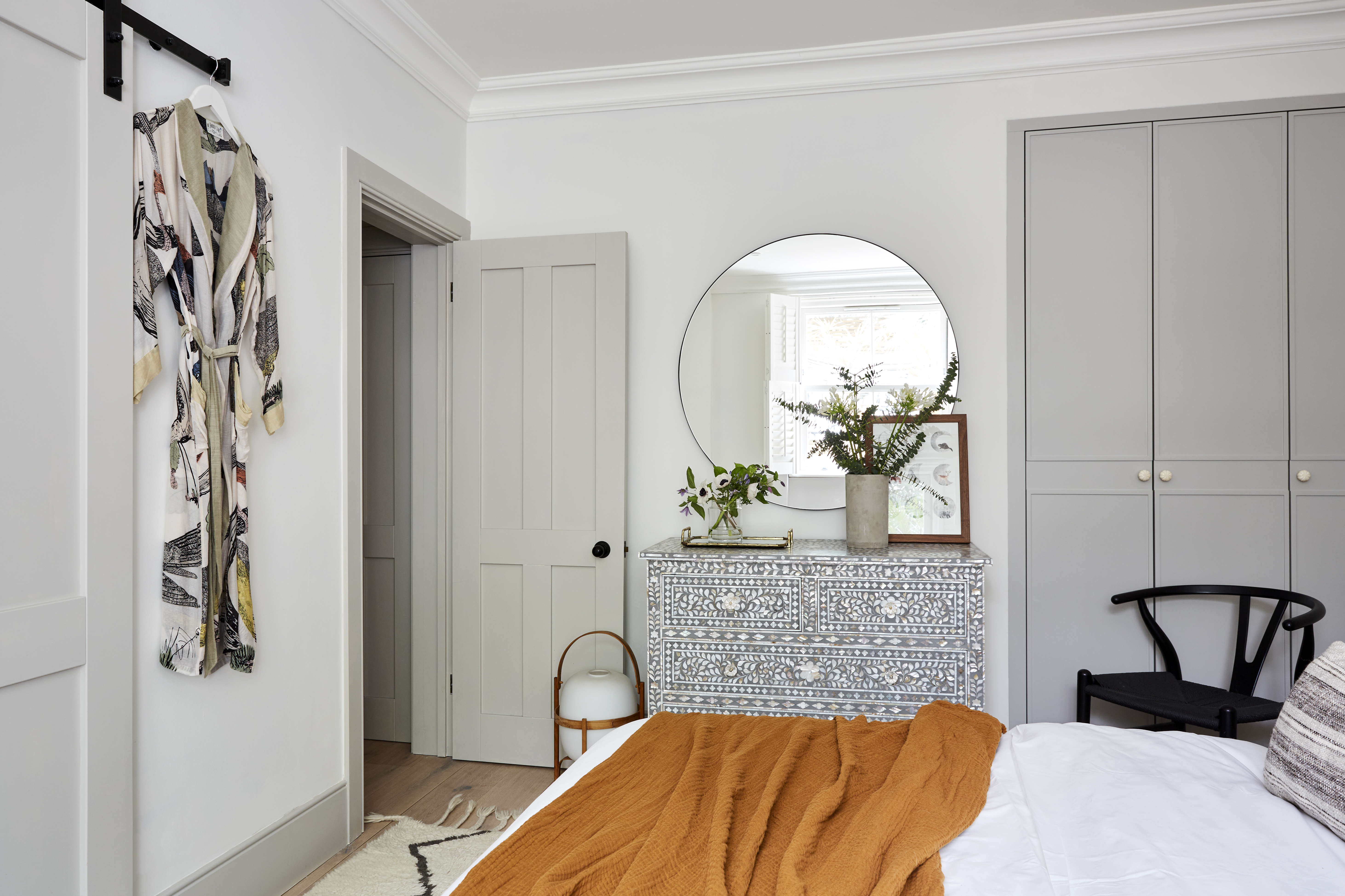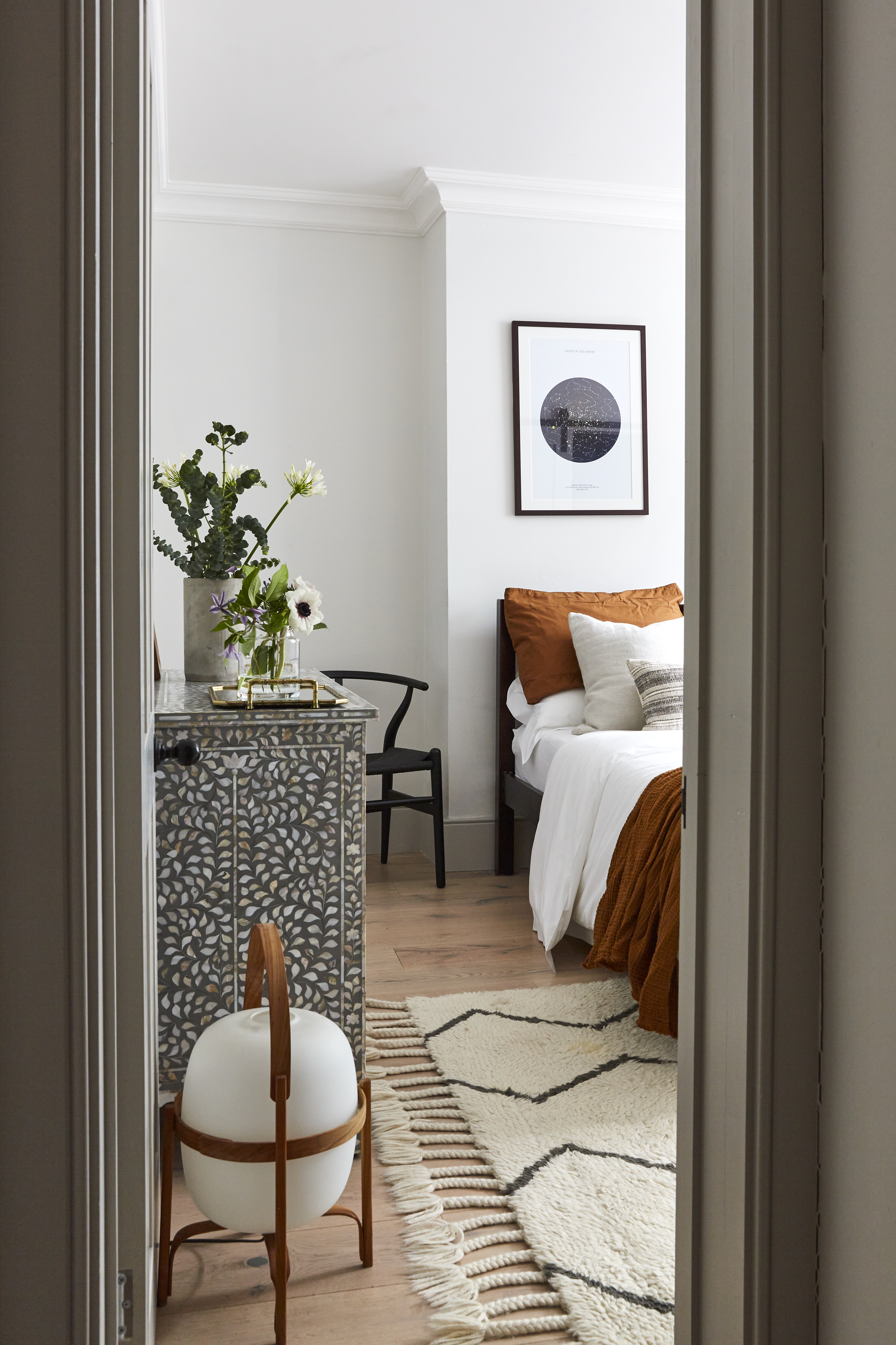 A creative reinterpretation of an awkward understairs layout in a classic southwest London basement and ground floor flat. We reworked a bathroom and guest bedroom configuration to create a generous main bedroom and ensuite, re-siting an existing entryway to allow for a generous shower and freestanding bath. Textural terracotta toned brick slips and matte black tapware introduce a softly industrial note, while the silhouette of the staircase is incorporated into the scheme. A newly designed bedroom features soft greys and warm russets. Upstairs, we also refurbished a cloakroom, picking up on the green and white tones of the family bathroom and added a new glazed door to the rear to channel in light.