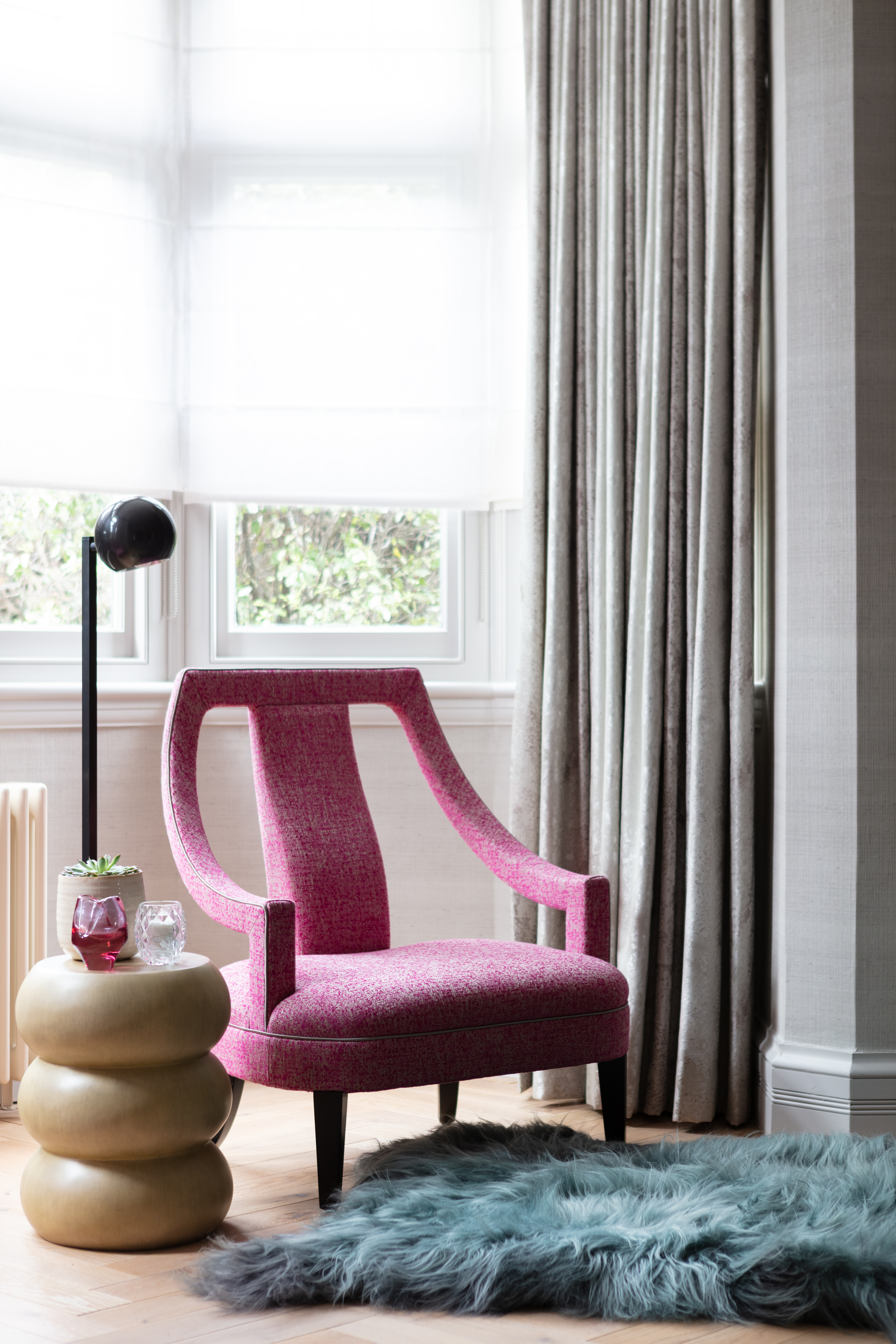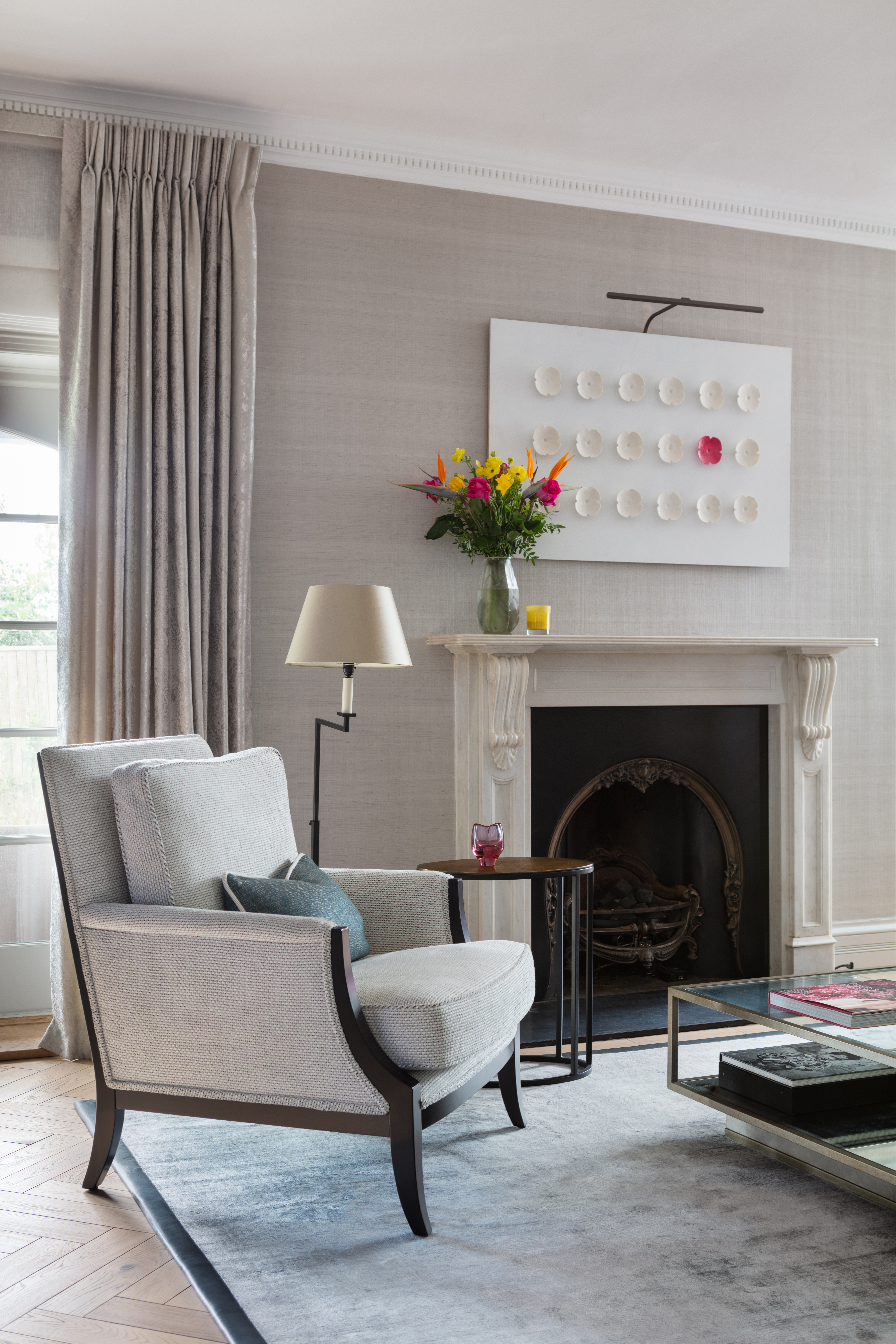 Our client brief was to incorporate and integrate a newly acquired and very bold “Audrey” artwork within a full formal sitting room re-design. This elegant family home on Wimbledon Common already contained some wonderful Edwardian features, but was rather bland and dated, and so a more contemporary ambience was achieved with the application of textured linen wallpaper, a neutral palette of soft textured fabrics, and vivid pops of colour on soft and hard furnishings to create balance with the painting. The inter-connecting wood panelled study underwent a similar transformation, with the introduction of bold mustard flashes within the bespoke joinery