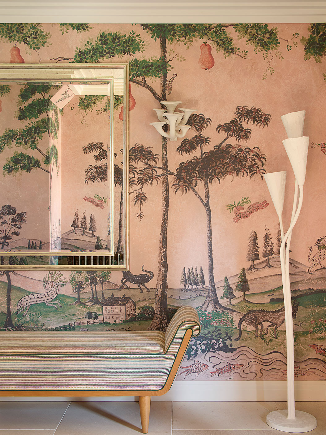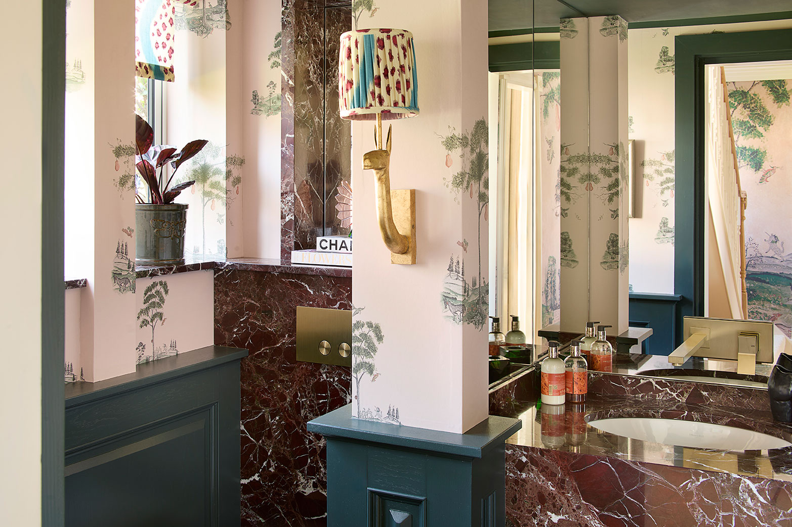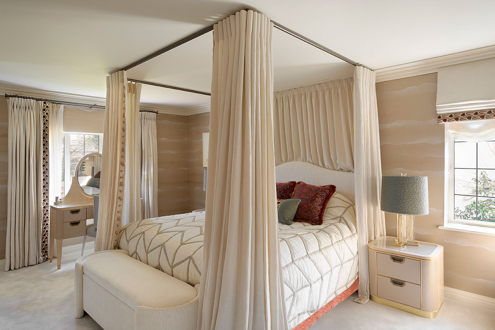 In the main lounge, Tobias Oliver Interiors introduced a flexible layout with three distinct seating zones tailored for different moods and gatherings. These include an L-shaped sofa for music and television, a tête-à-tête piece by the fireplace for intimate conversation, and a bold bar area for socialising. The conservatory was also transformed, with dramatic window treatments and concealed curved banquettes lending a theatrical, immersive quality to the space.